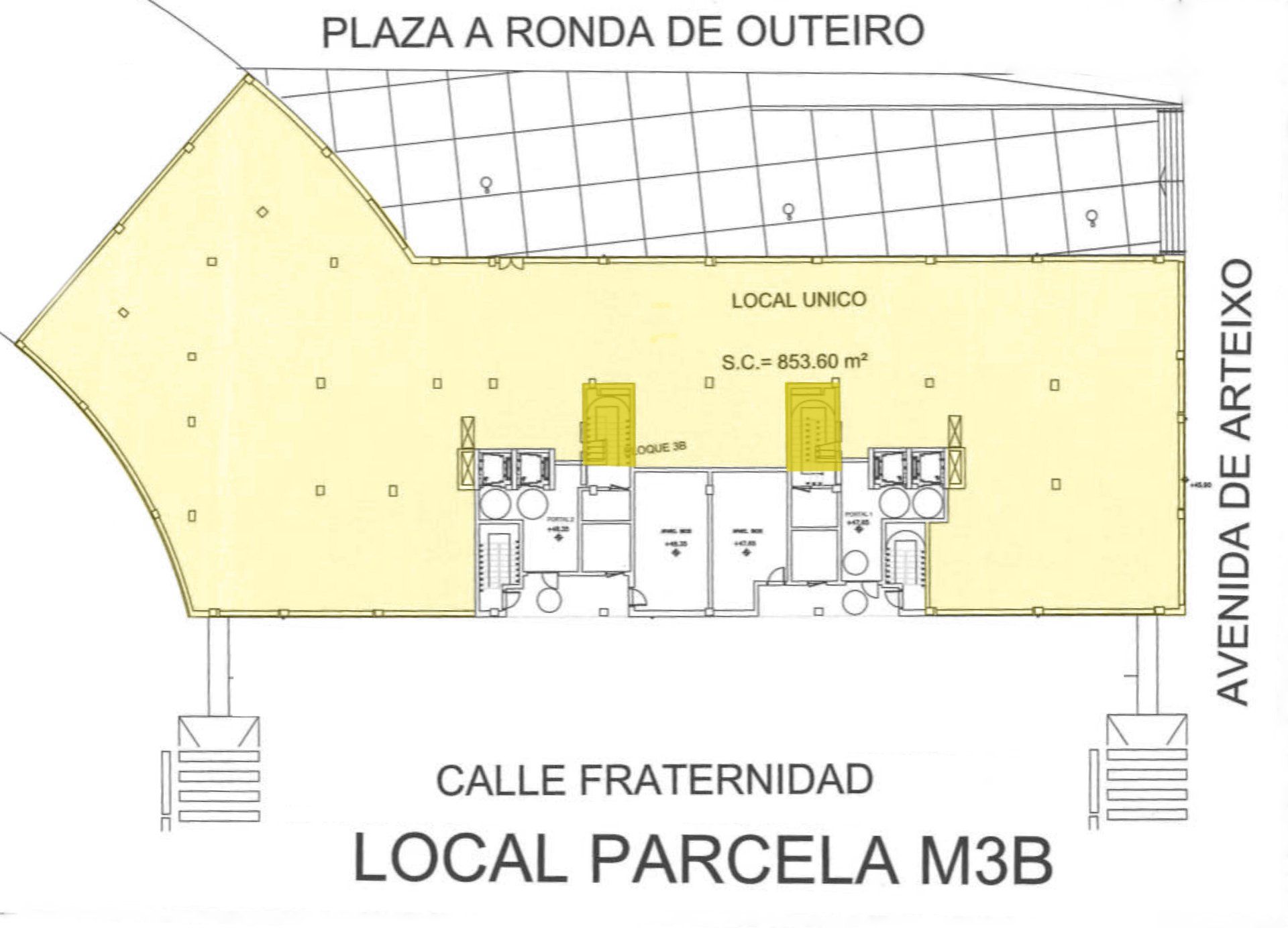 Local comercial en planta baja de edificio de reciente construcción en calle Fraternidad nº 2, esquina con Av. Arteixo. Tiene una superficie de 853 m2 construidos, mas de 50 metros de fachada a dos calles y una plaza peatonal, y una altura interior de mas de cinco metros. Podría segregarse en varios locales de menor tamaño sin dificultad, como apunta el plano que acompañamos de cinco locales de diverso tamaño.