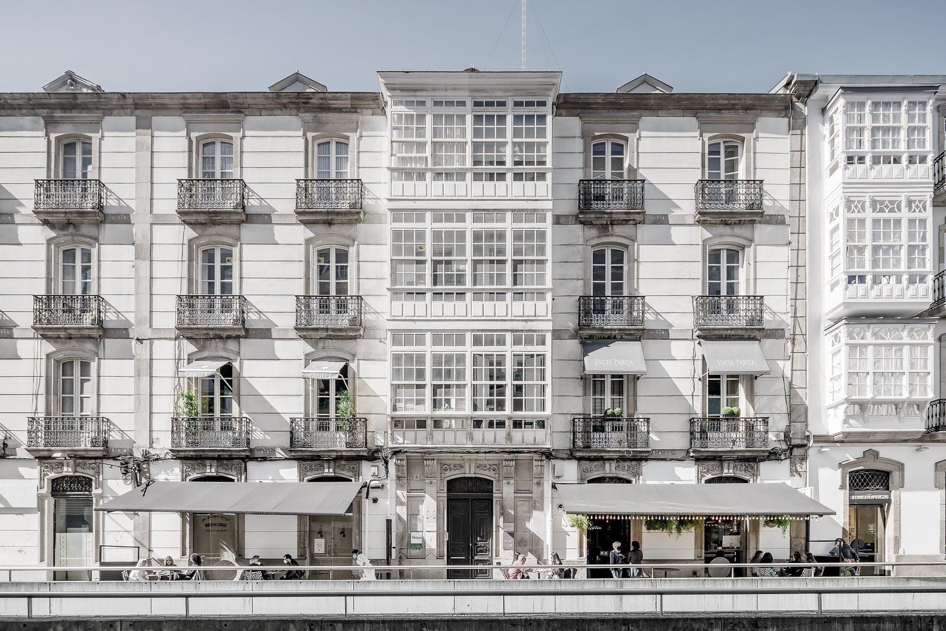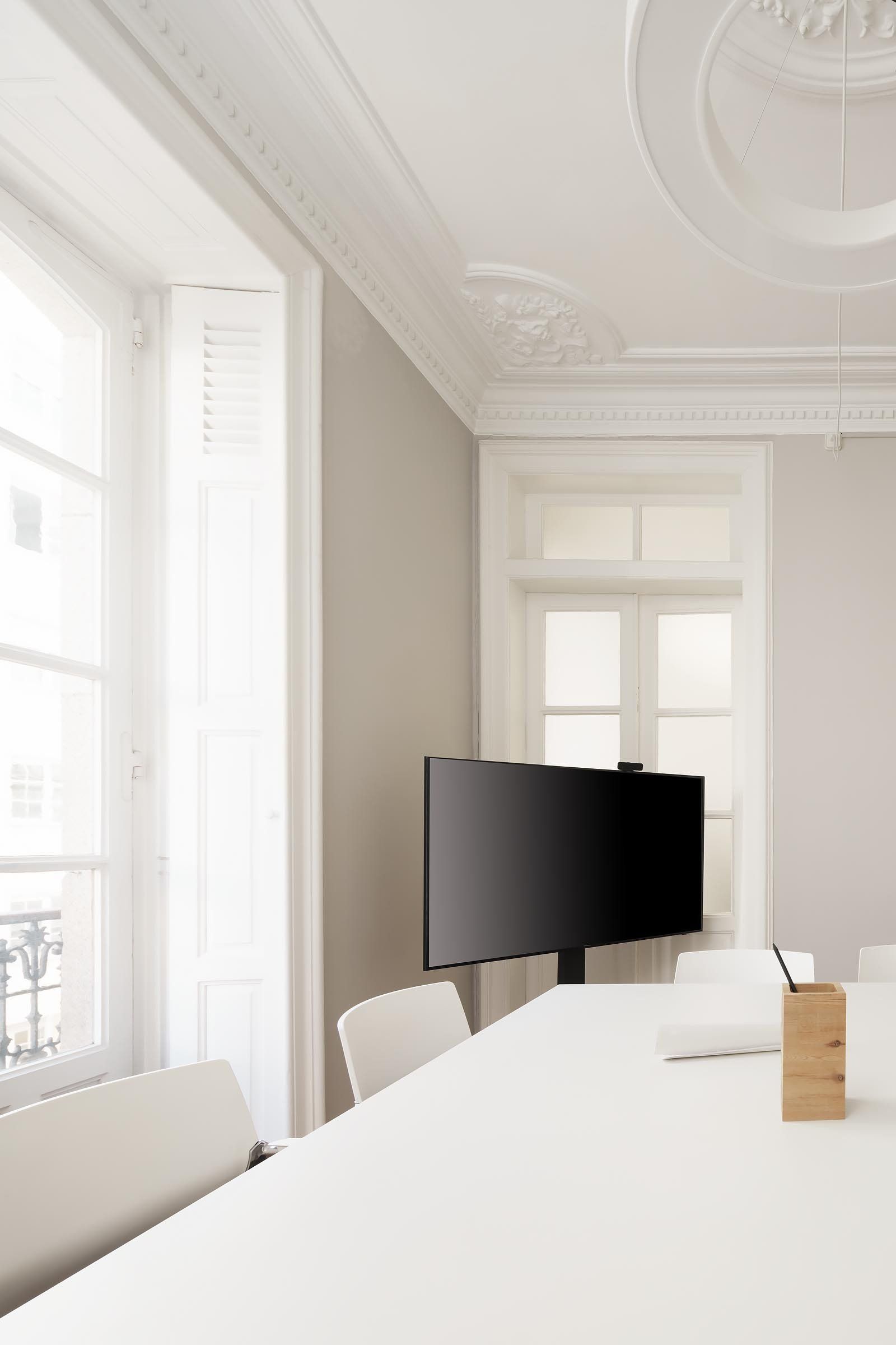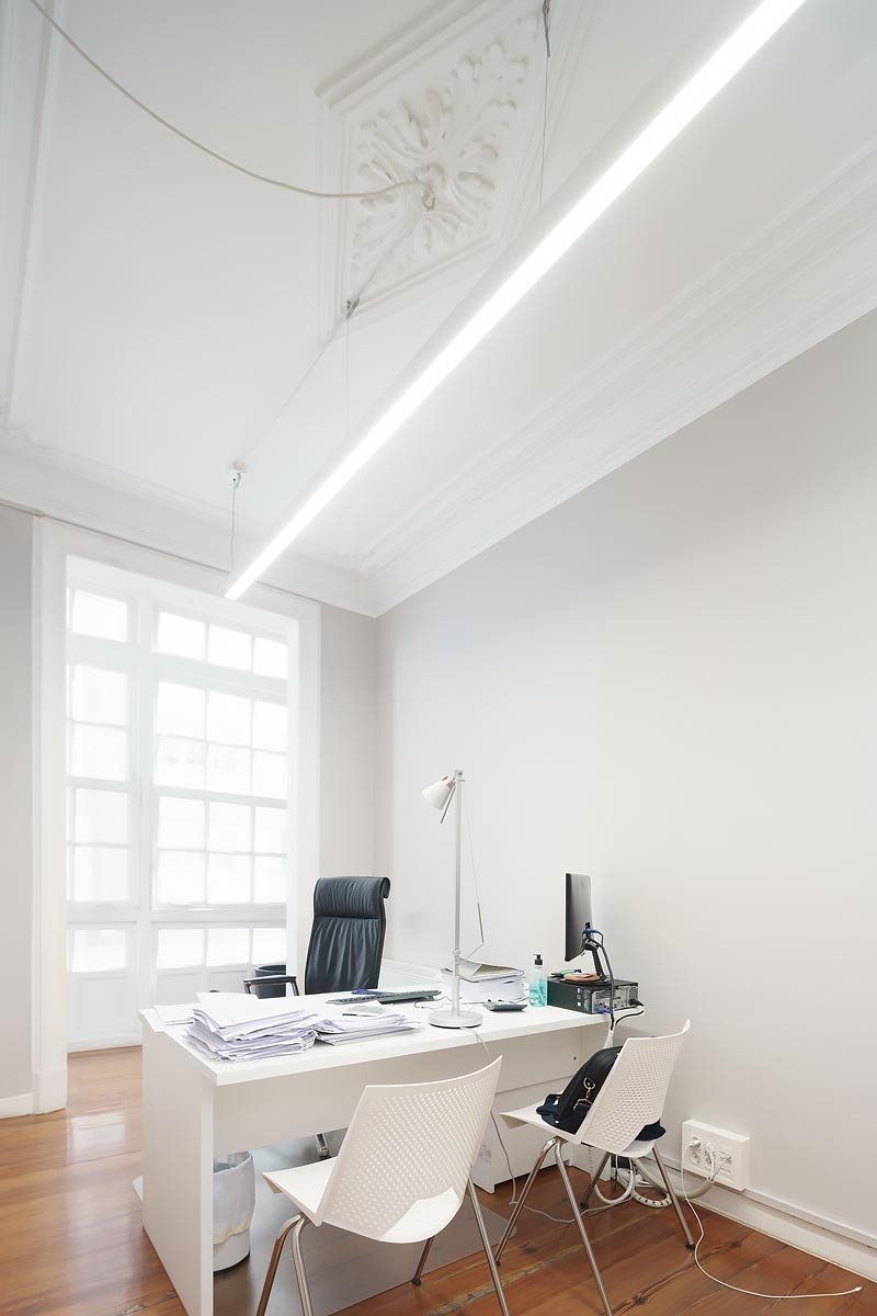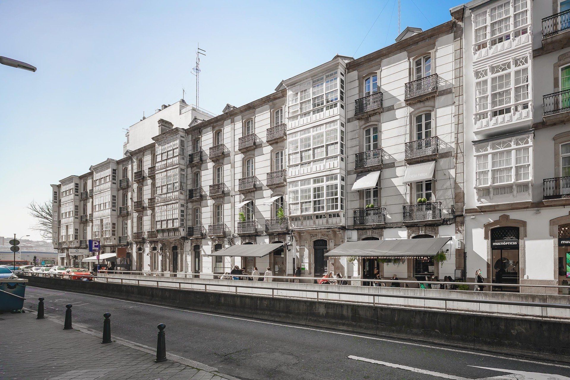 Oficina distribuida en sala de juntas, cuatro despachos (uno utilizado como archivo), dos baños y hall de entrada. Sus suelos de tarima, techos altos y ornamentados, carpinterías lacadas en blanco, grandes ventanas exteriores y amplios espacios, convierten este singular local en un agradable y cómodo lugar de trabajo, a lo que une su exclusividad y privilegiada ubicación en la calle Picavia al lado de la plaza de Lugo, en la ubicación más valorada de la ciudad.