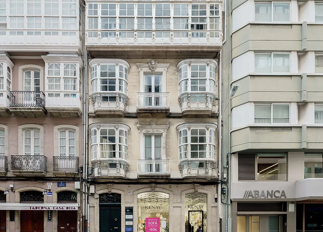 Vivienda a 50 metros de la plaza de Lugo, en el centro de La Coruña, ubicada en primera planta de edificio singular de primeros del siglo XX, perfectamente conservado, con majestuosos portal y escaleras de acceso, amplias y características galerías en sus dos fachadas de piedra, que sumadas a su patio interior iluminan la vivienda de 220 m2 construidos ocupando la totalidad de la fachada a la que se le añade su terraza privada exterior de más de 80 m2