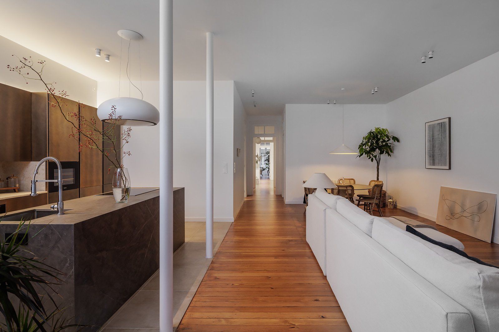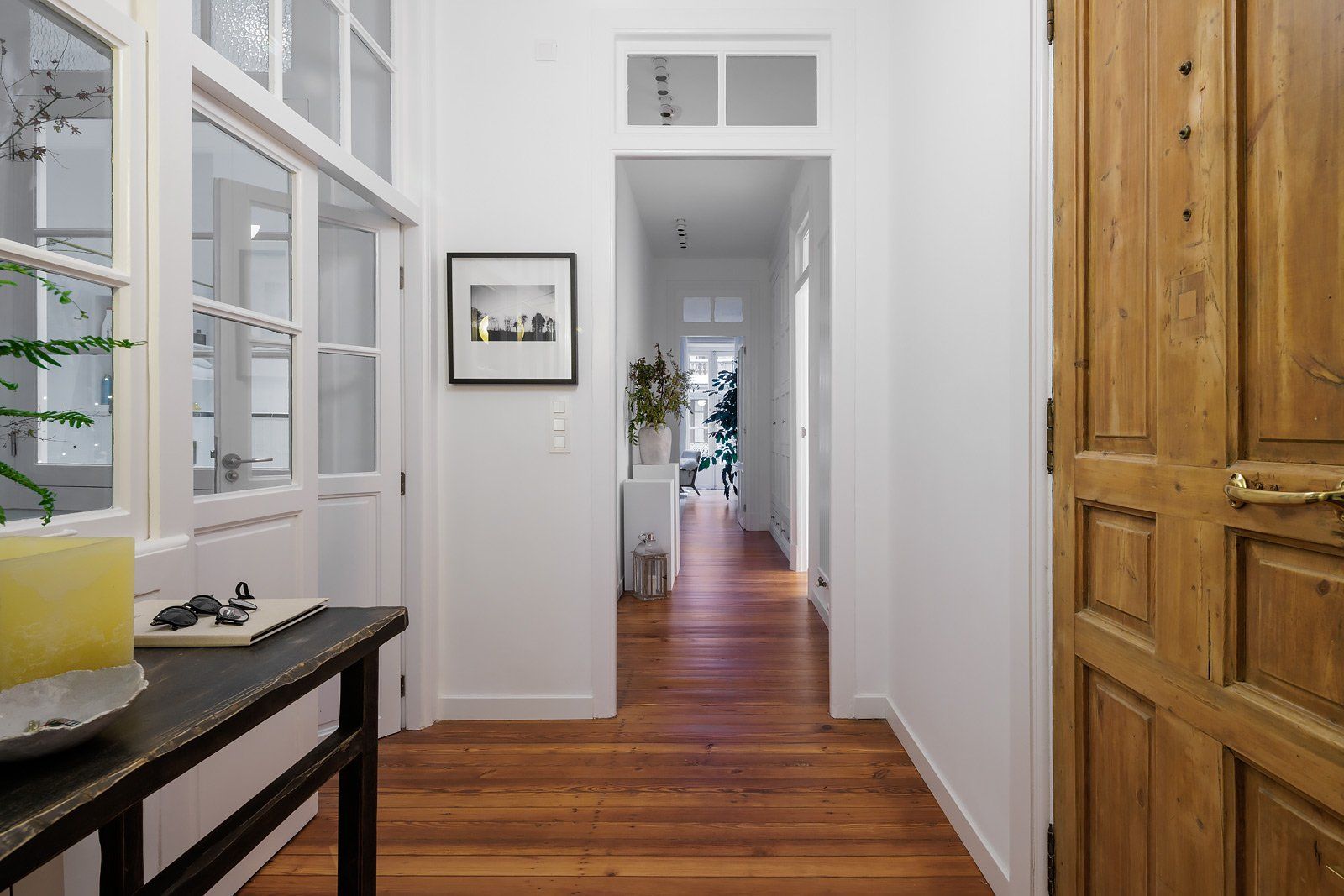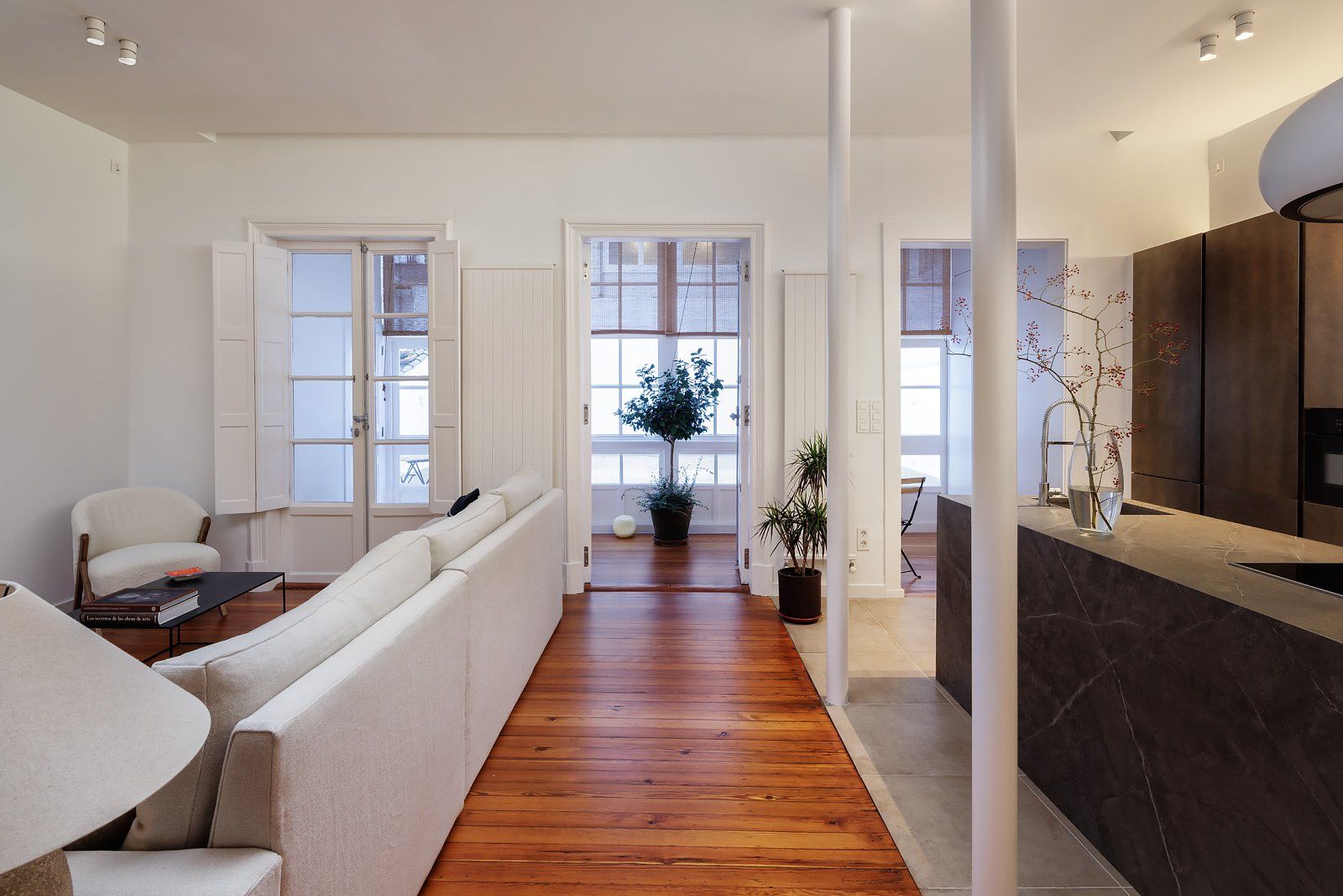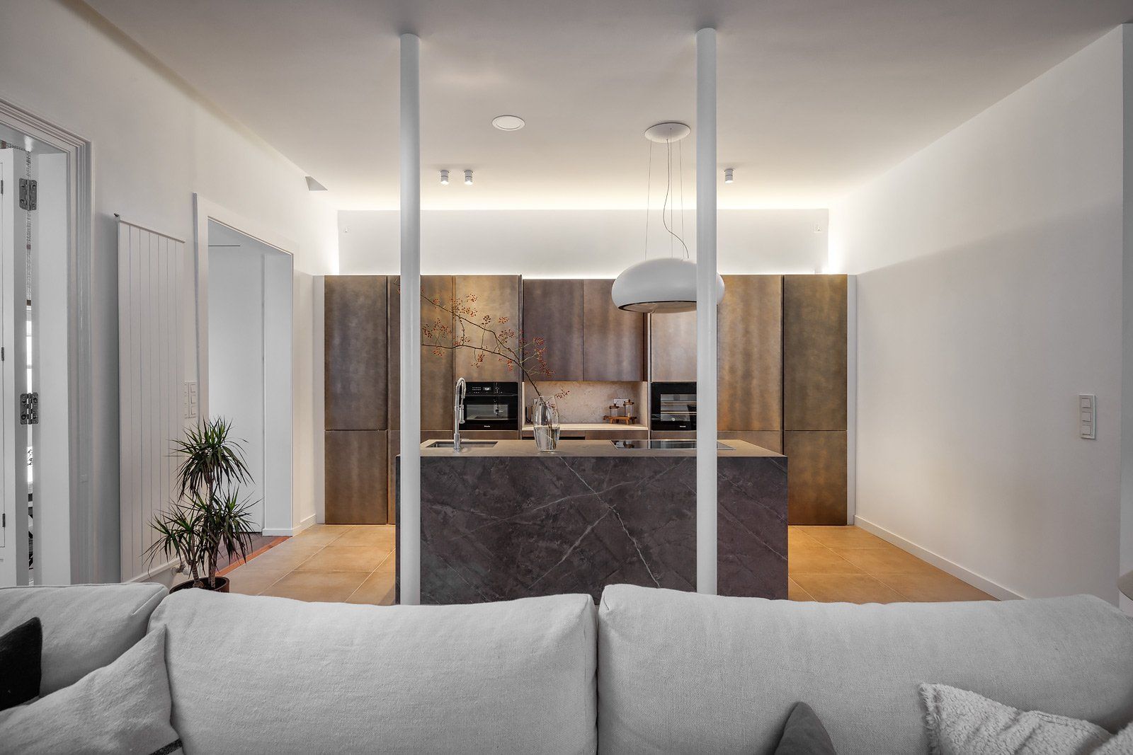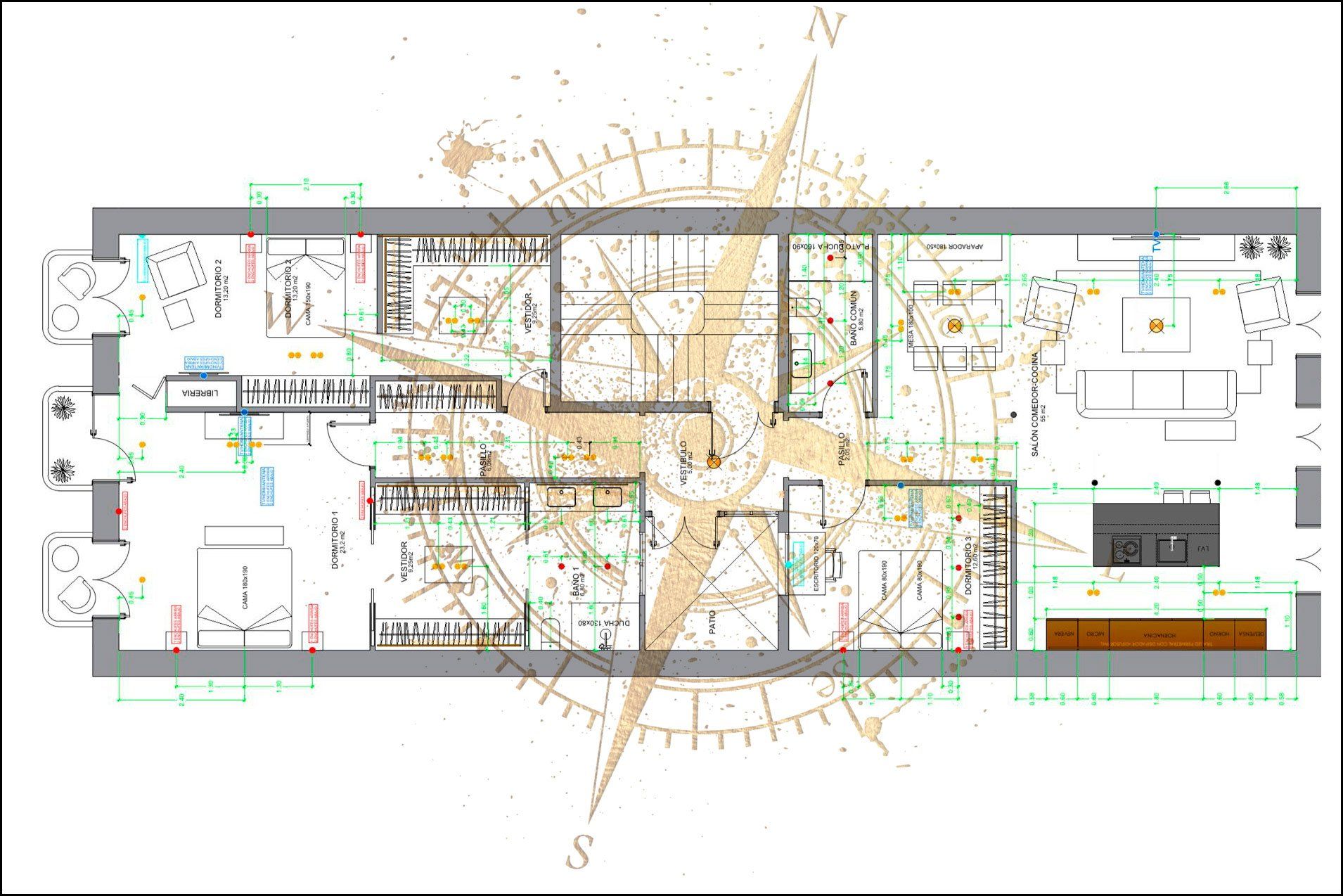 Distribuida en tres dormitorios dotados de vestidor dos de ellos y baño en suite el principal, baño de invitados y amplio vestíbulo desde el que se accede al gran espacio de 55 m2 de superficie dedicados a salón, comedor y cocina anexa con meseta central, desde el que también accedemos a los 80 m2 exteriores que elevan al máximo el atractivo y posibilidades de uso de este exclusivo inmueble.