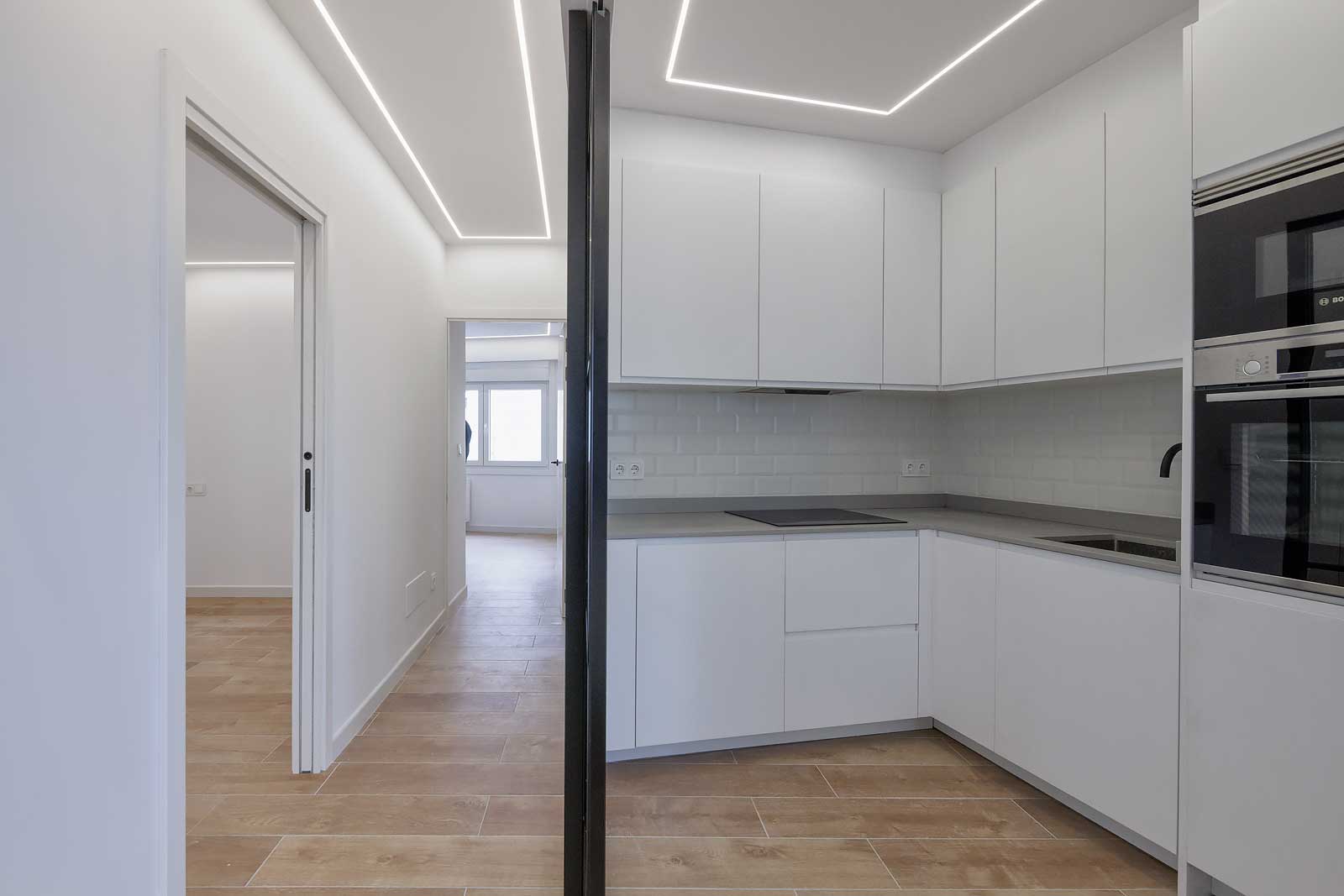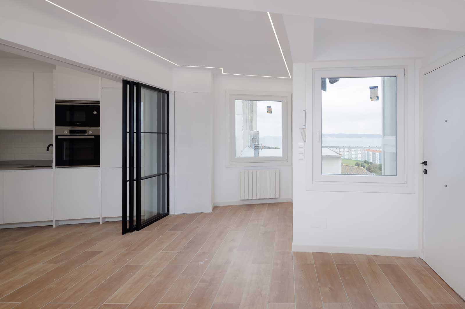 Piso de 70 m2 construidos distribuido en salón-comedor con cocina americana separada por cierre acristalado, amueblada y equipada con electrodomésticos, dos dormitorios y dos baños completos, uno de ellos en suite con el dormitorio principal.