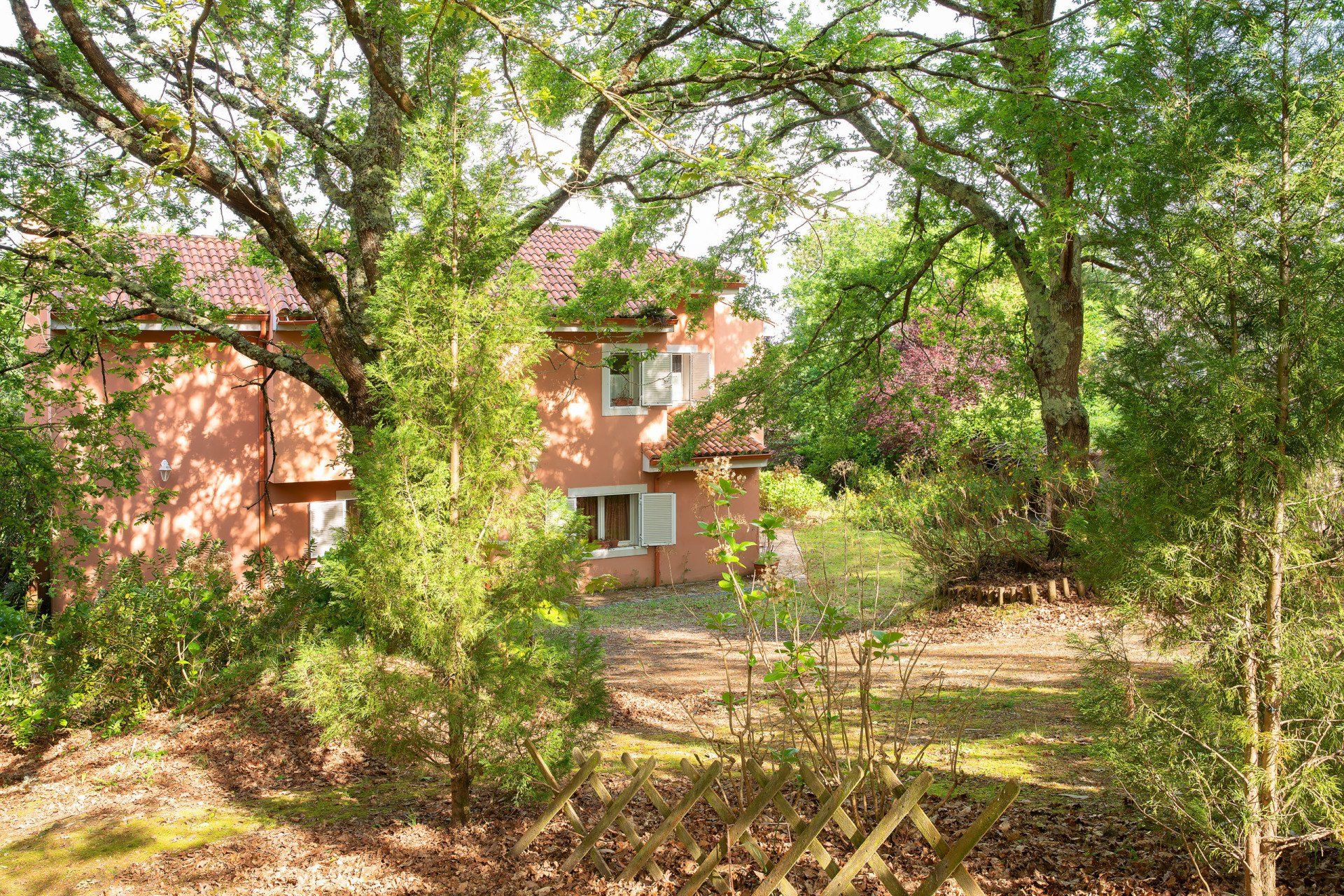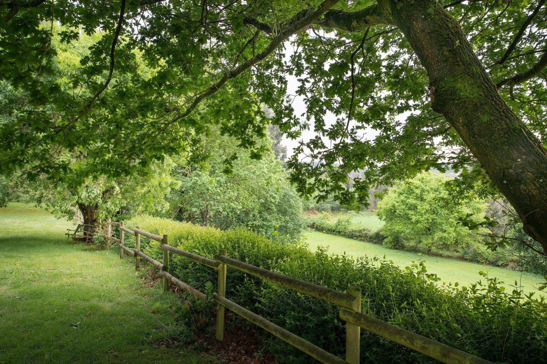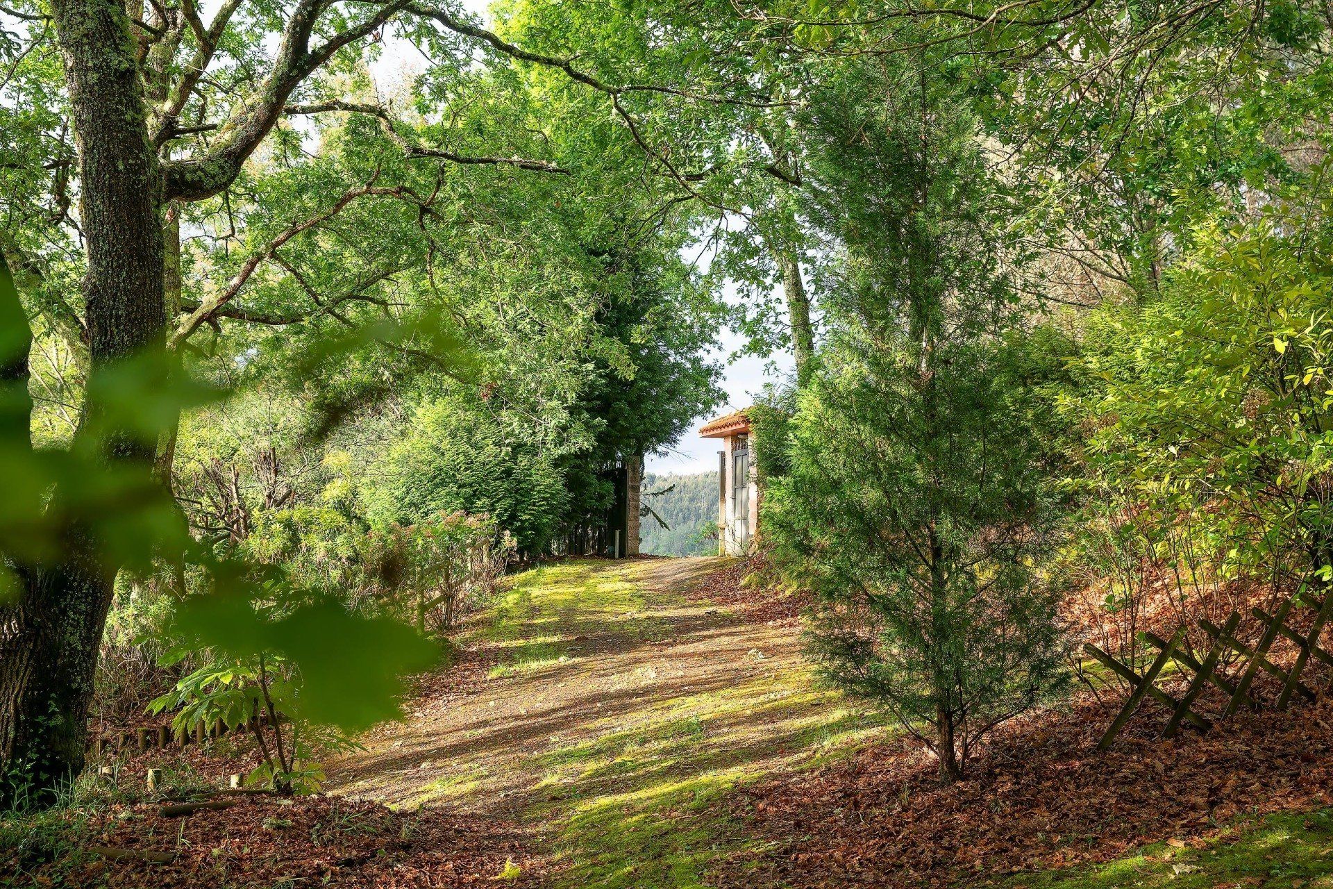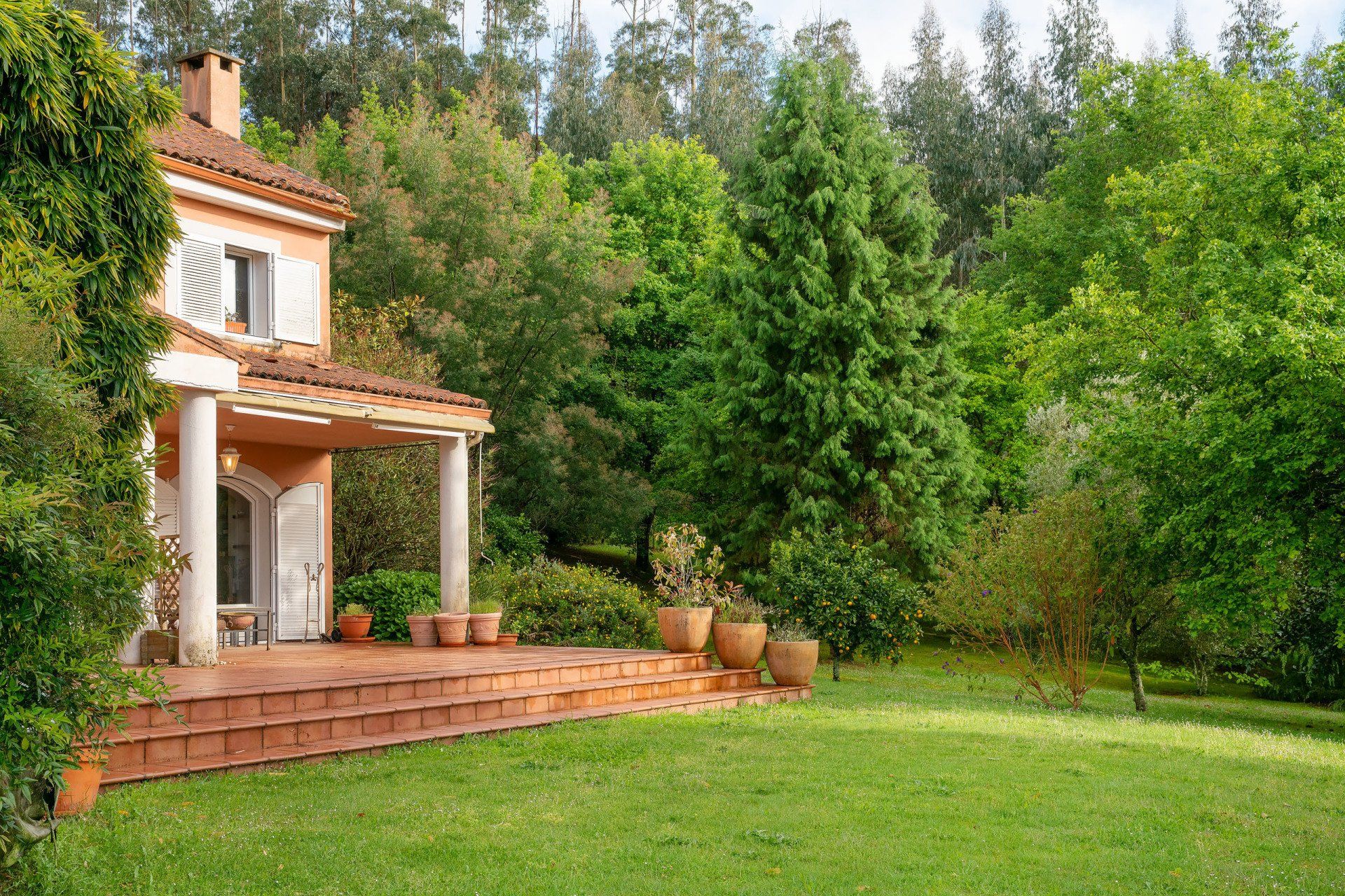 En la impresionante parcela encontramos una imponente variedad de arboleda, tanto frutal, como ornamental y autóctona, entre la que destacan varios robles centenarios. Varios focos en el jardín, orientados hacia los árboles, iluminan la parcela.