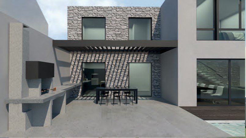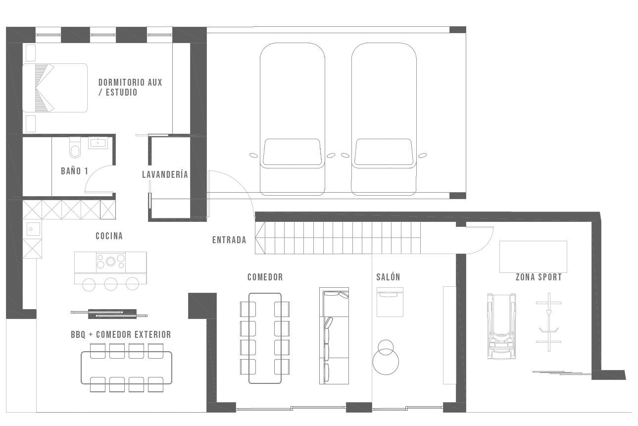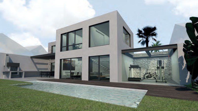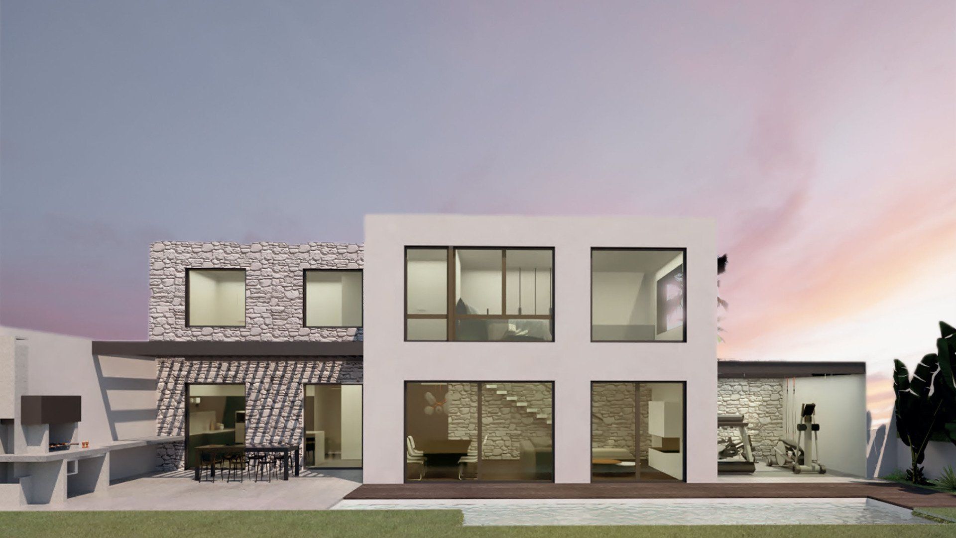 En el alzado posterior la vivienda se abre y se vuelca al jardín, aprovechando al máximo la luz natural y permitiendo el disfrute total de las zonas exteriores. La vivienda cuenta con zona de BBQ, gimnasio semi exterior, y piscina.
