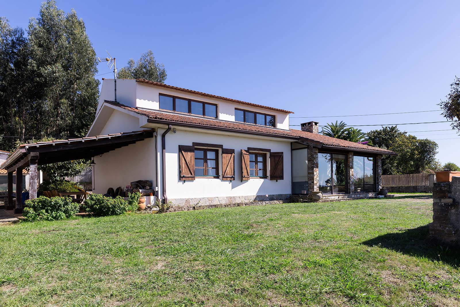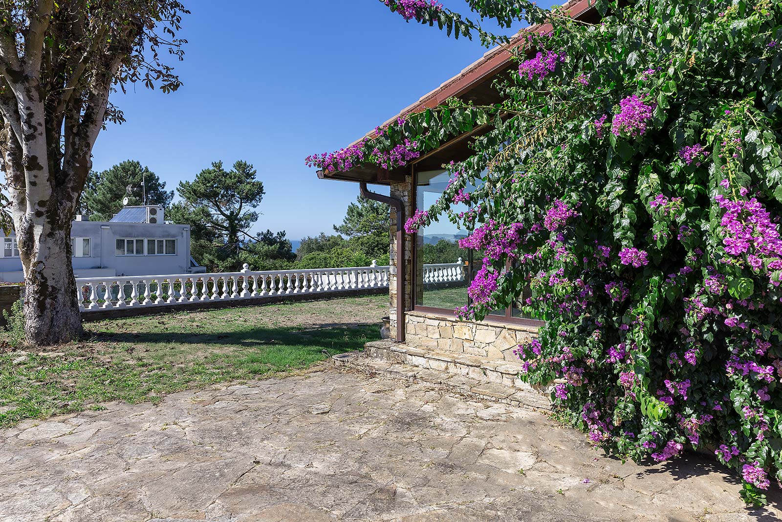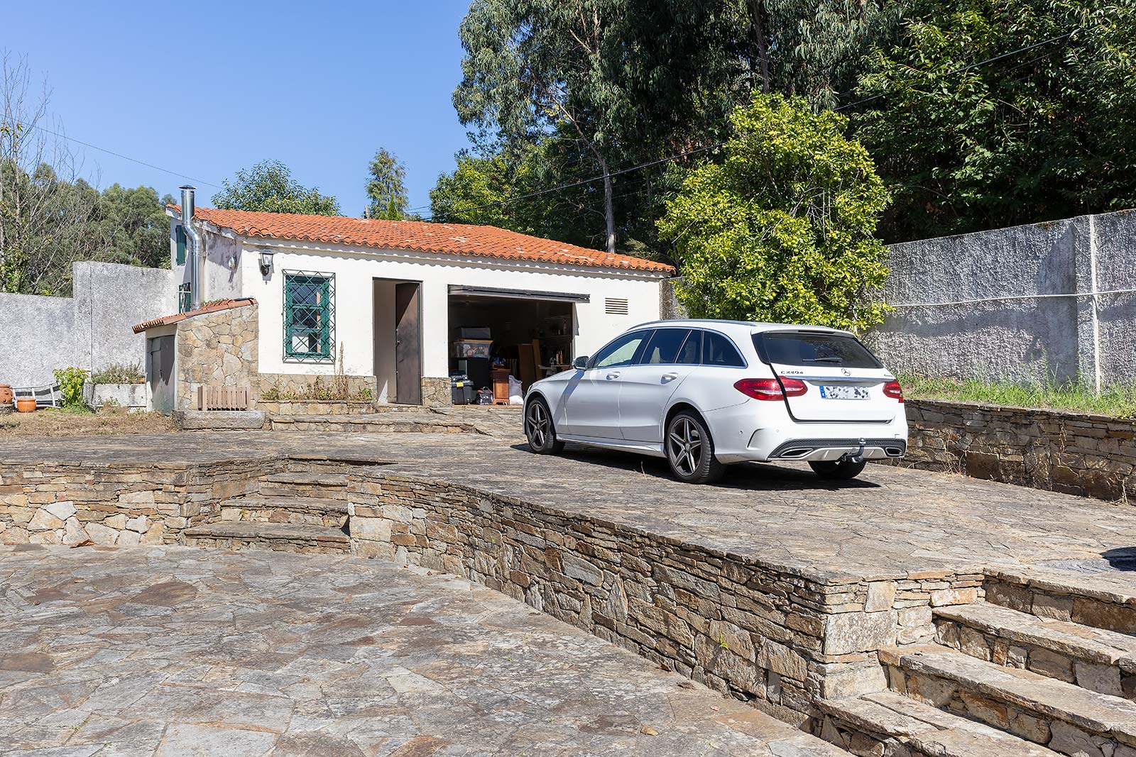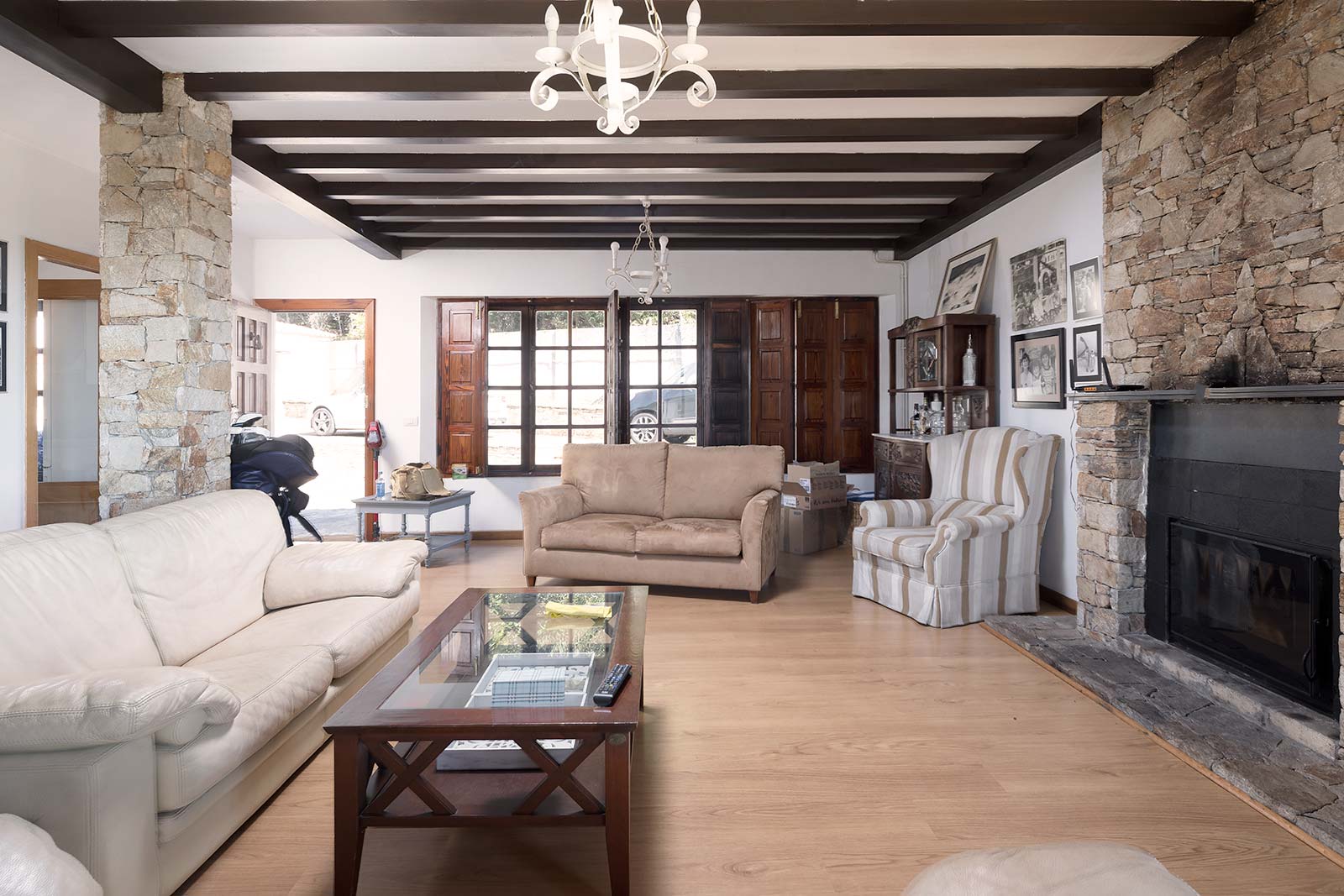 En su parcela privada de 1.500 m2 ajardinada y cerrada con muro de piedra, a través de su portalón automático se accede al garaje independiente, que comparte edificación con la sala técnica de calderas.