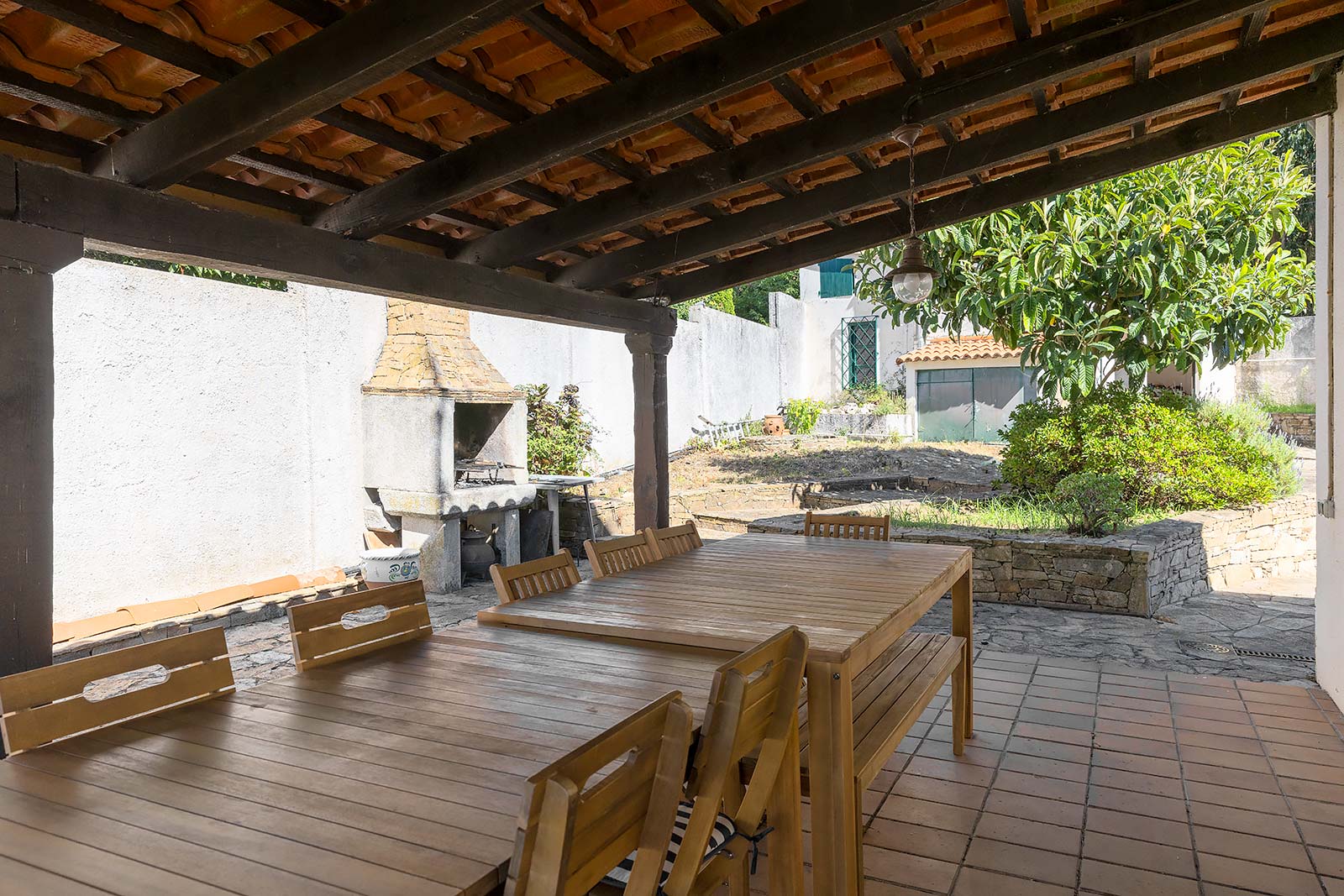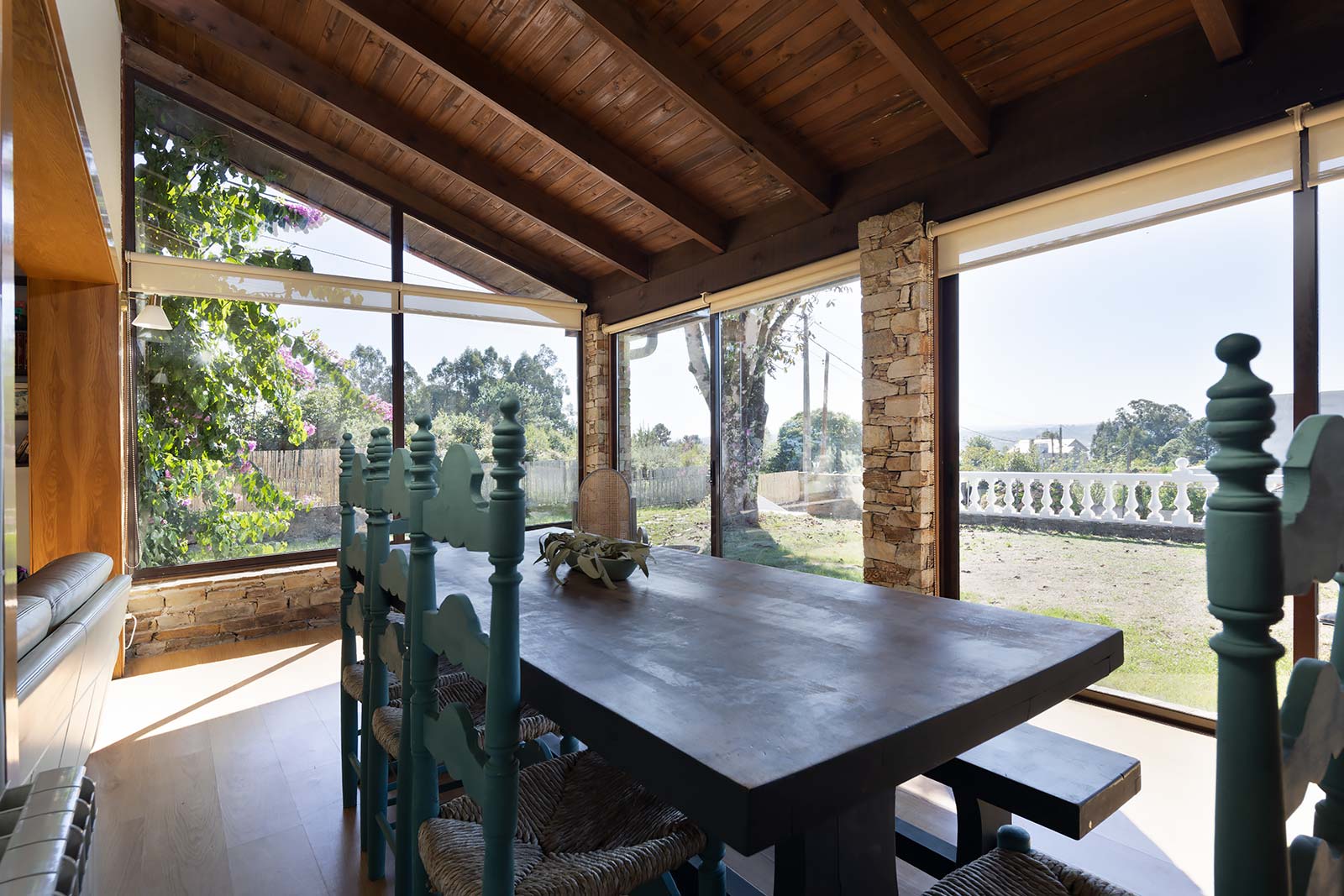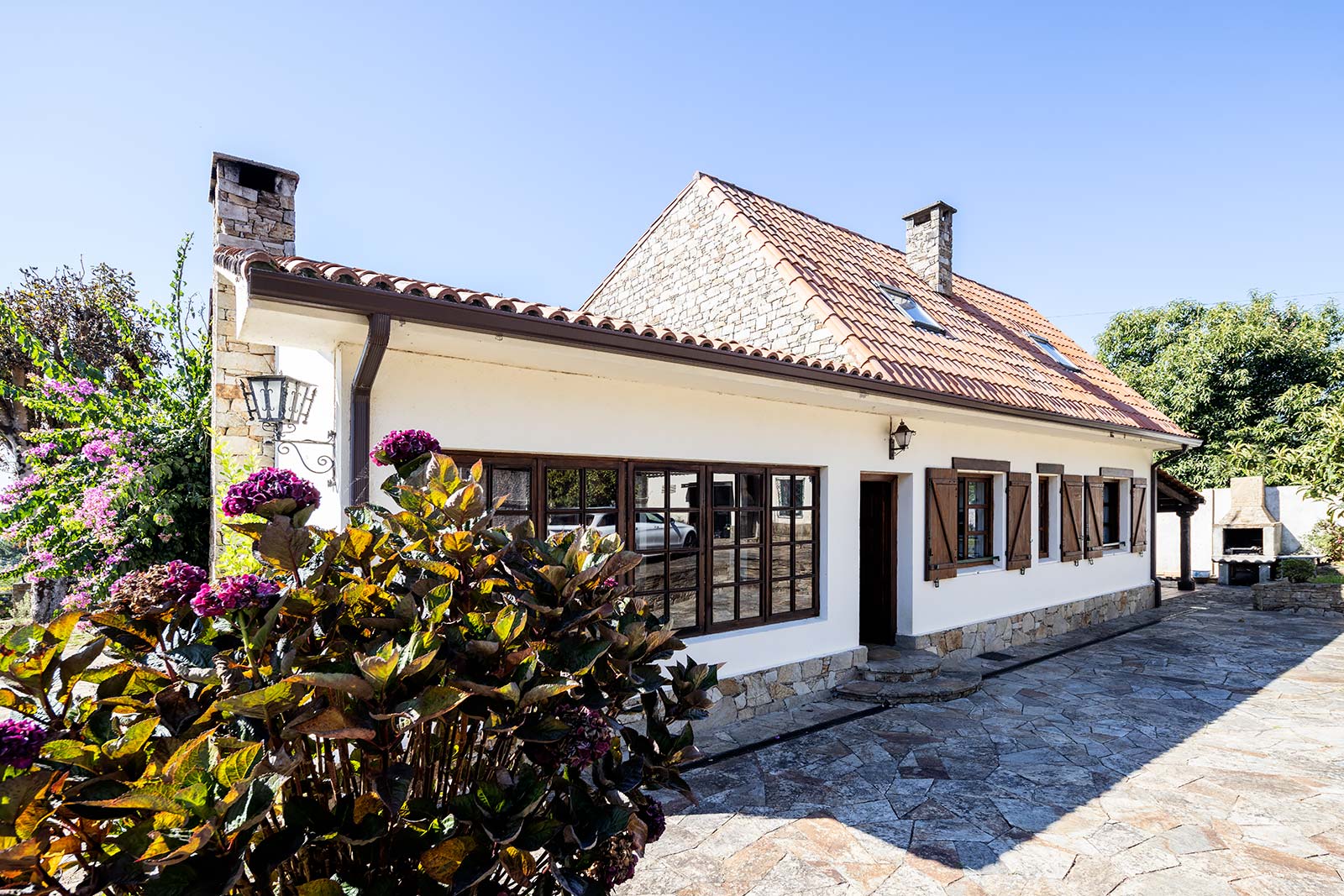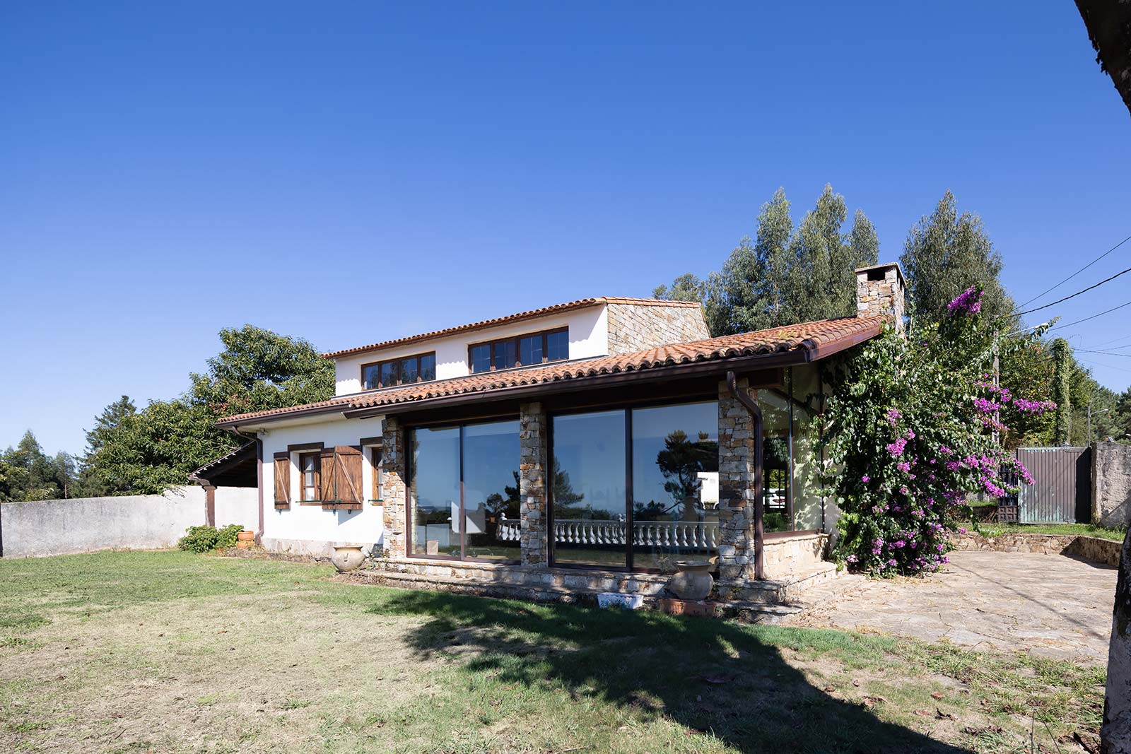 En su parcela privada de 1.500 m2 ajardinada y cerrada con muro de piedra, a través de su portalón automático se accede al garaje independiente, que comparte edificación con la sala técnica de calderas.