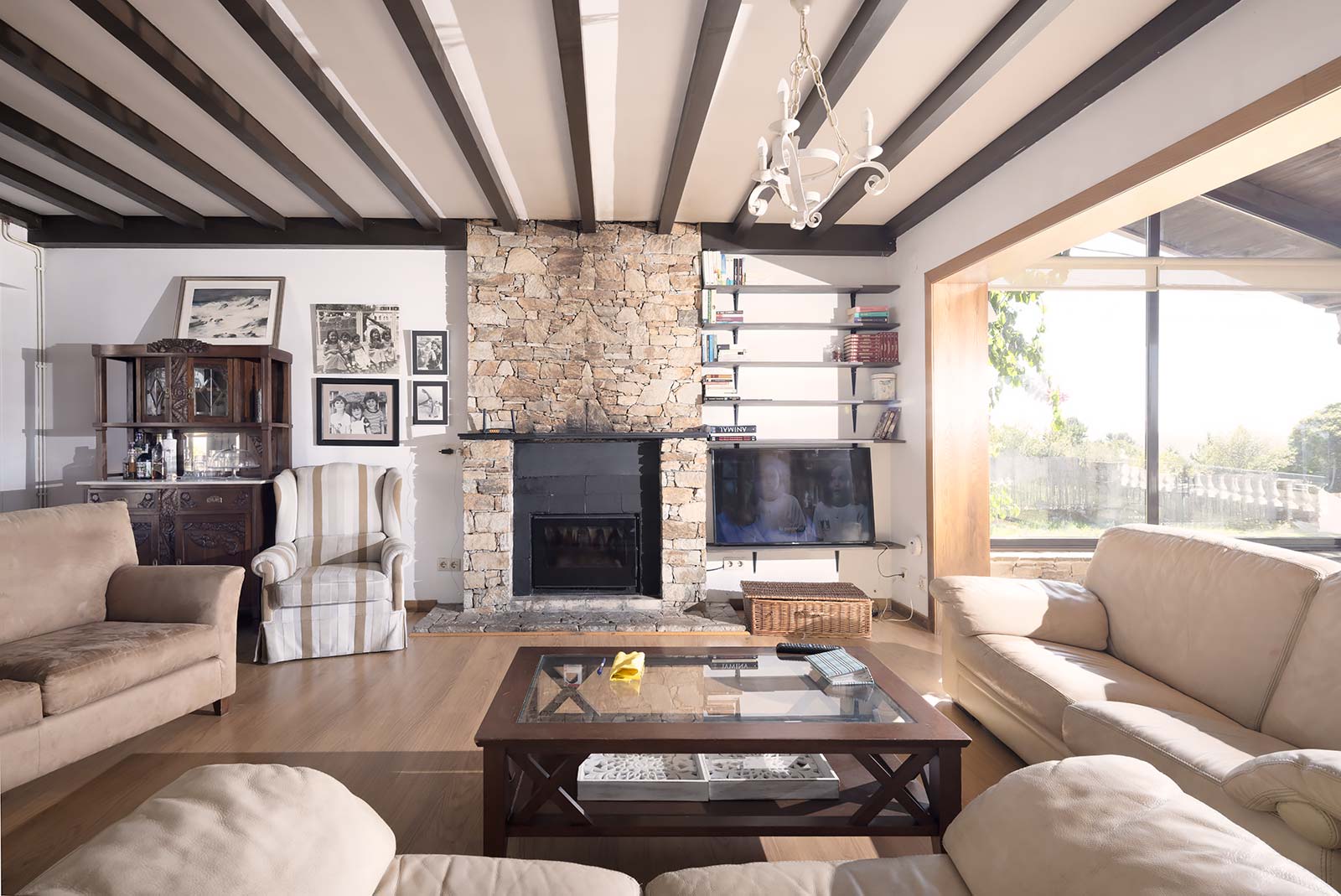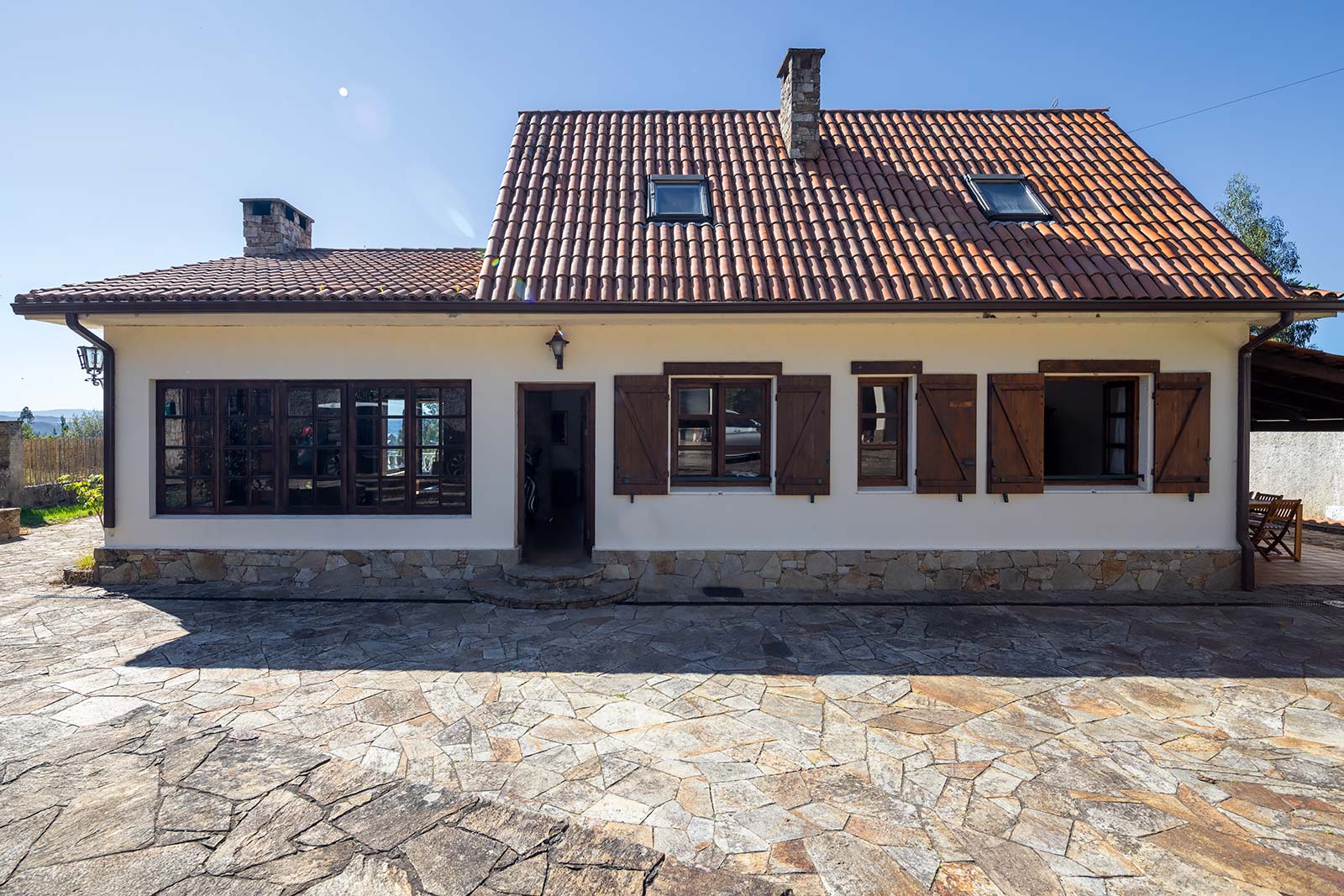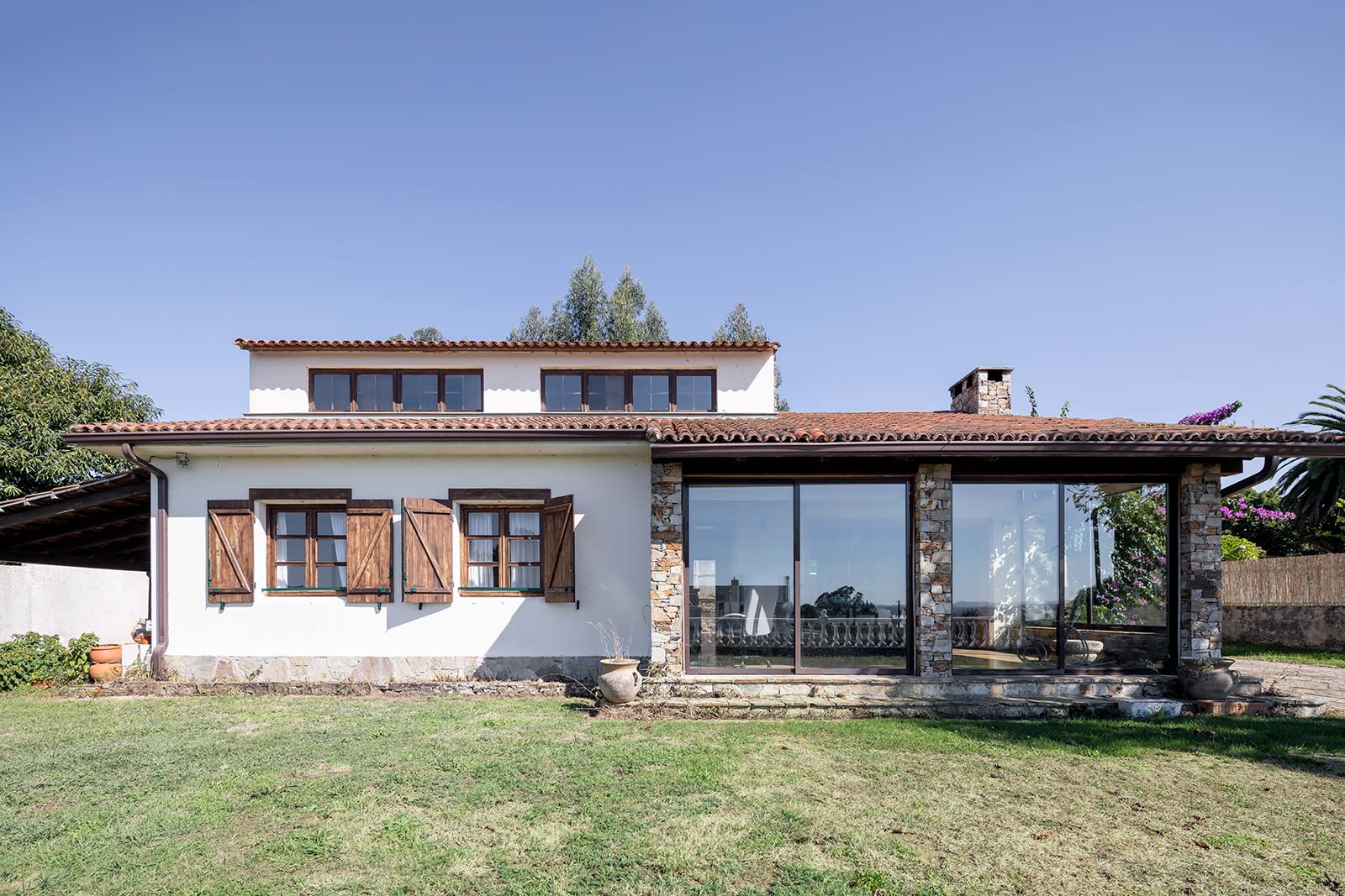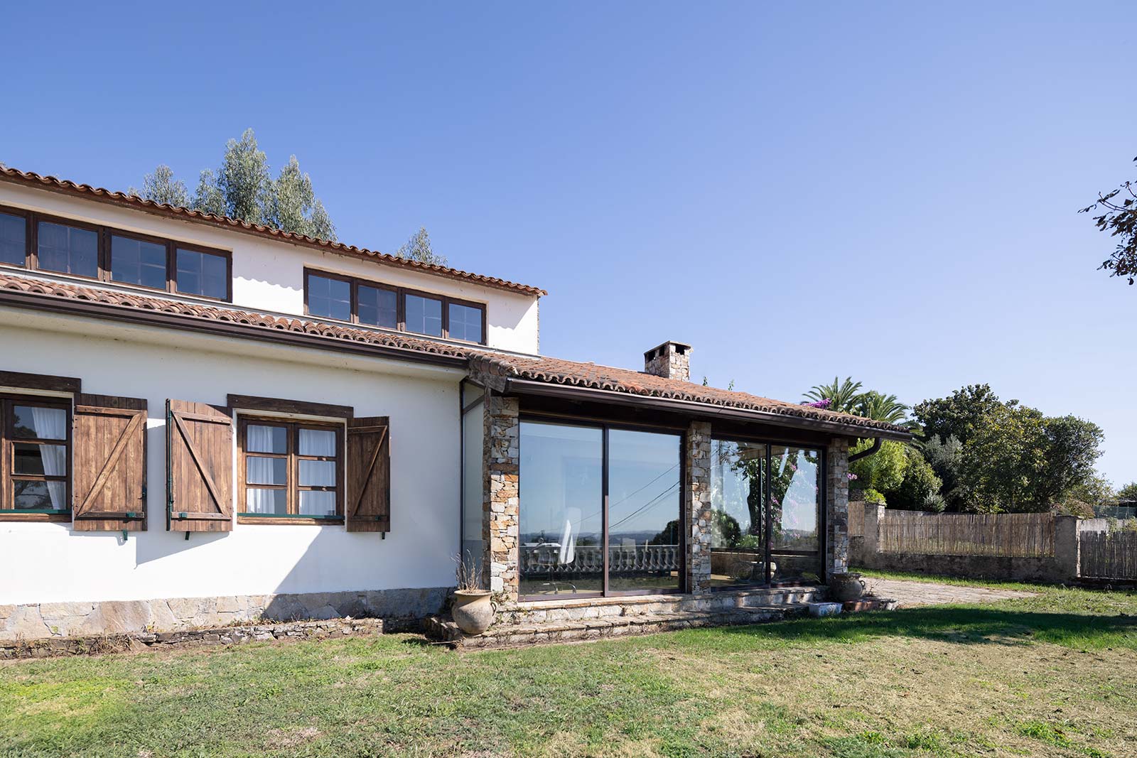En su parcela privada de 1.500 m2 ajardinada y cerrada con muro de piedra, a través de su portalón automático se accede al garaje independiente, que comparte edificación con la sala técnica de calderas.