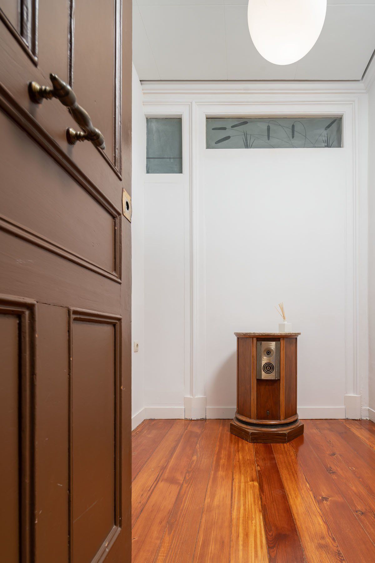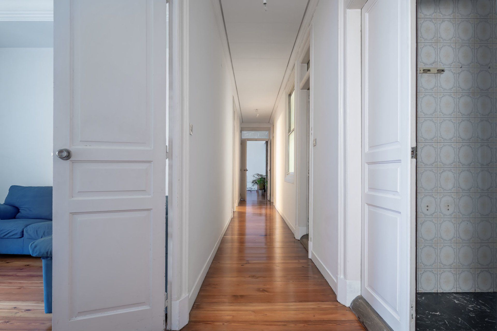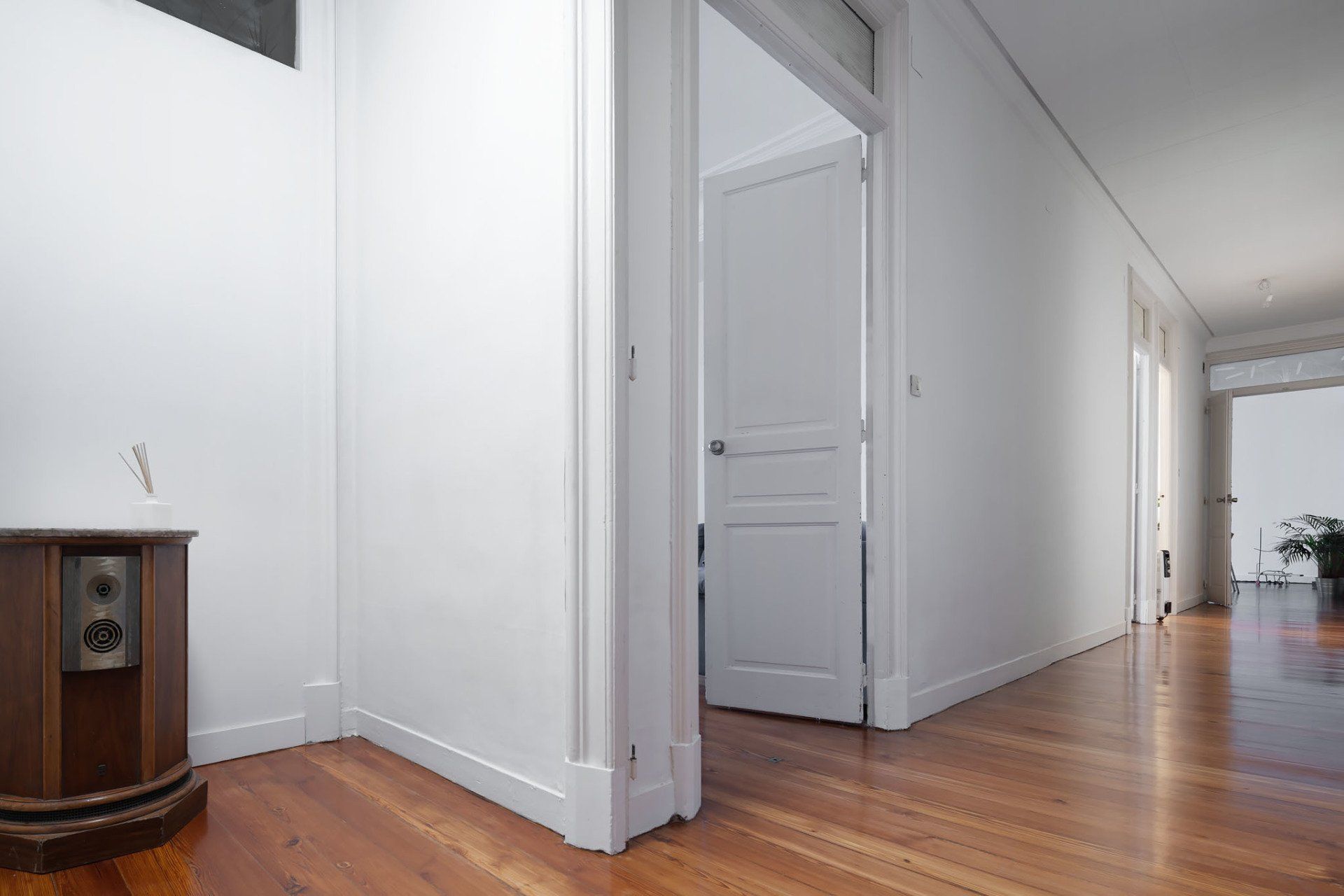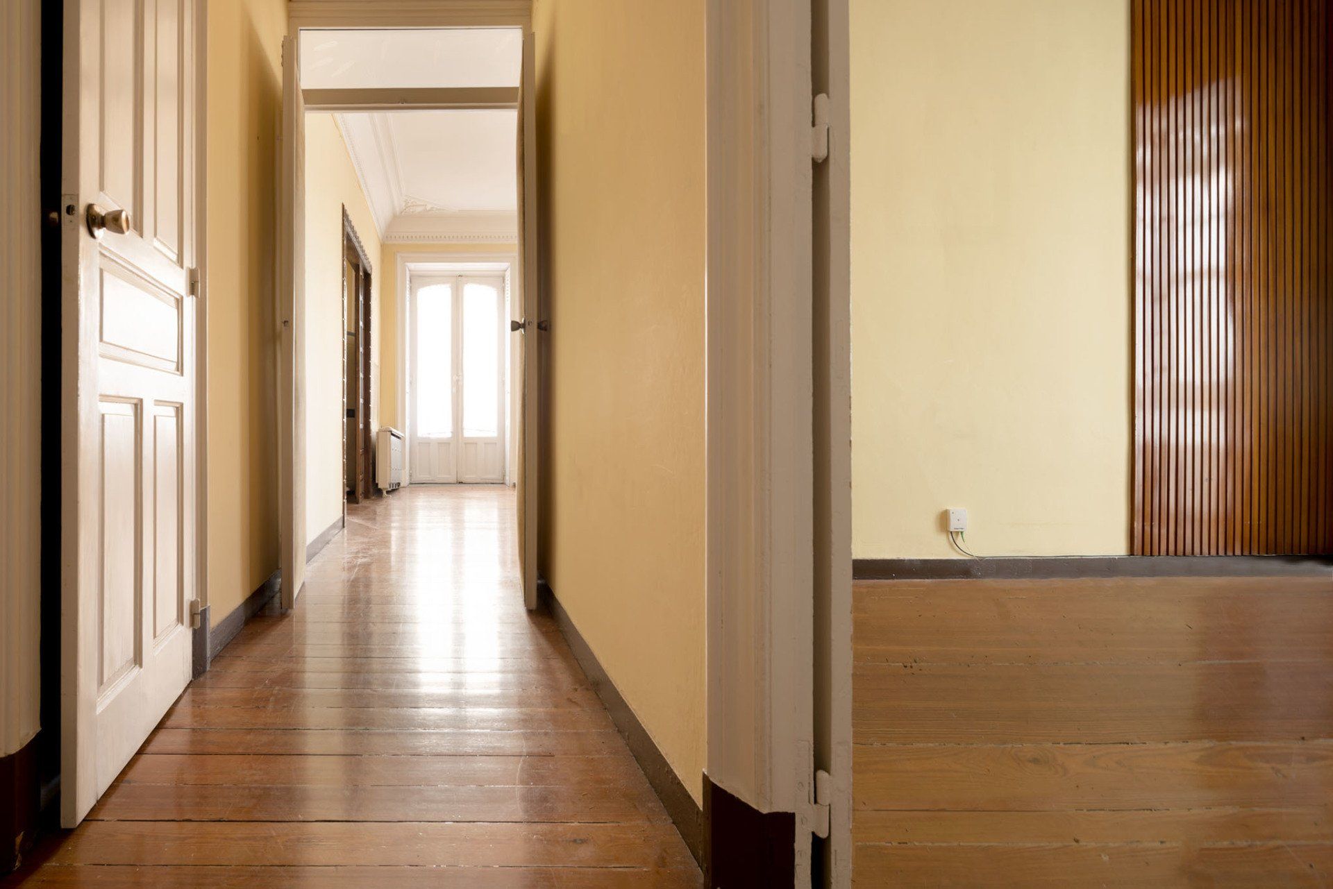 Vivienda totalmente exterior, con interiores amplios y luminosos gracias a sus techos altos con preciosas molduras y sus amplias ventanas. Valiosos suelos de tarima de pino tea en todas las estancias, salvo baños y cocina, puerta de entrada y puertas de paso originales, chimeneas en sus dos salones, etc.