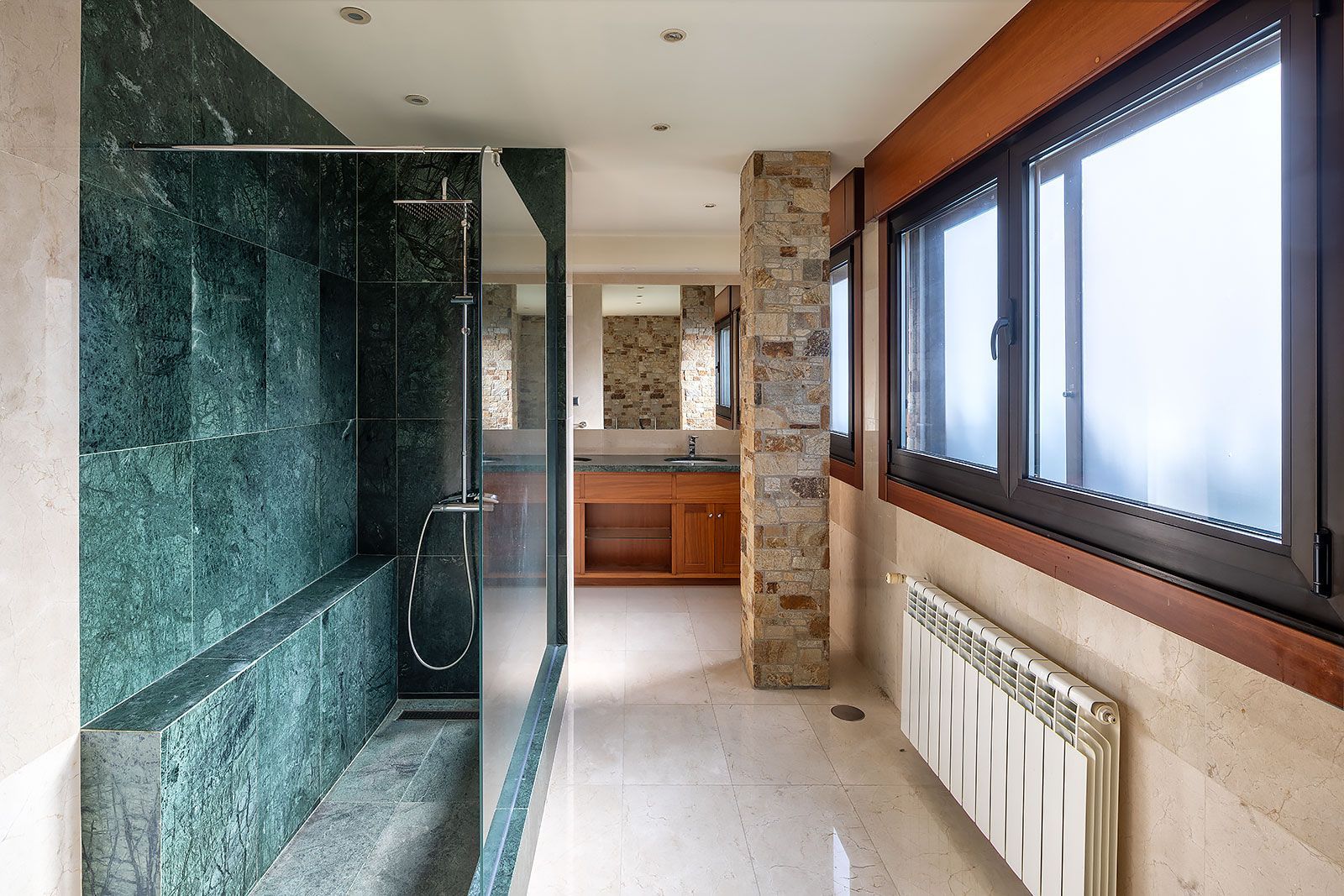 Pasando a la zona de noche en la planta principal encontramos un despacho con vistas al mar y tres dormitorios de buen tamaño dotados de armarios empotrados, un baño completo de pasillo que les da servicio y una amplia suite principal, que incluye un amplio dormitorio, un completo vestidor y un luminoso baño de gran tamaño, con bañera de hidromasaje y plato de ducha independientes.