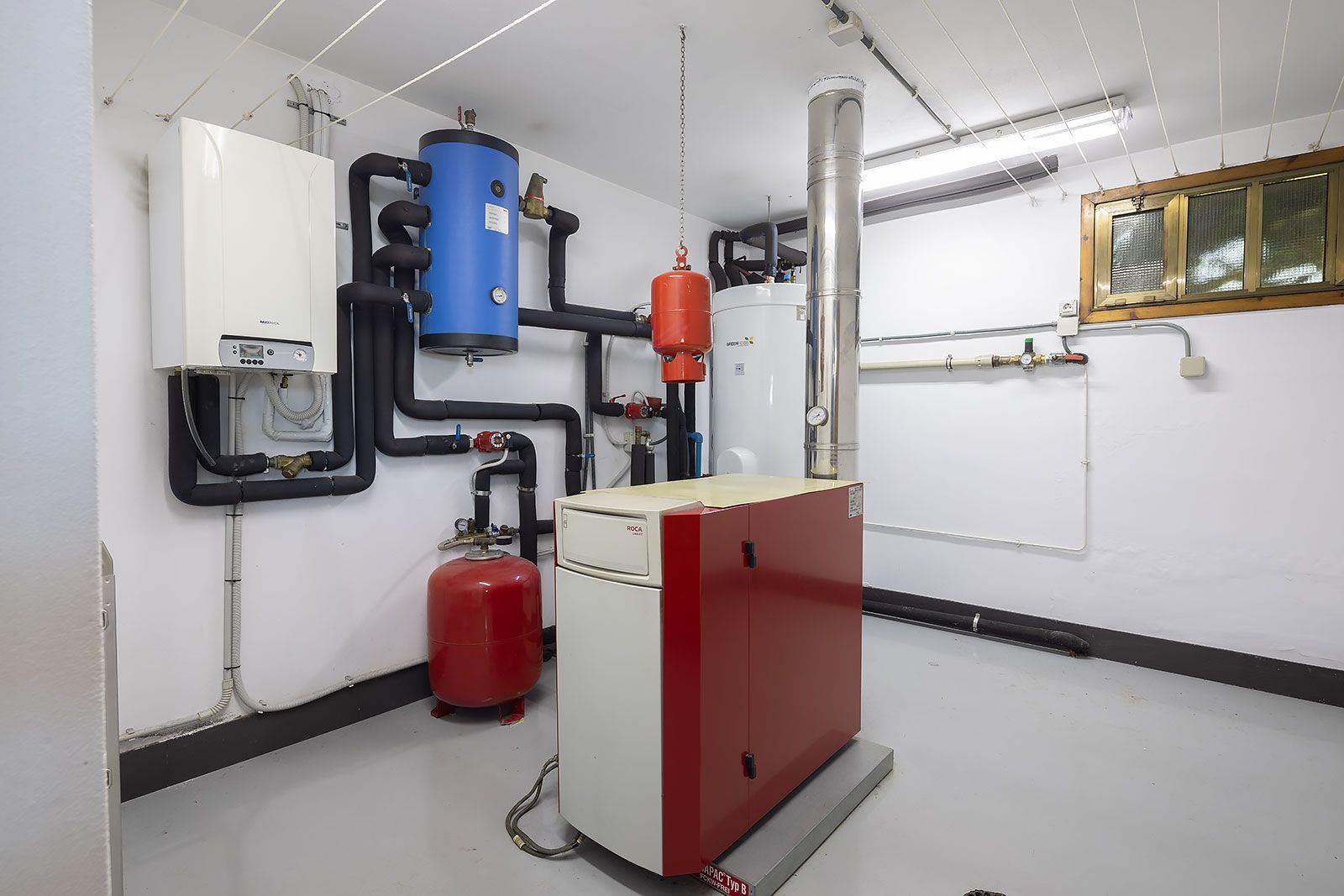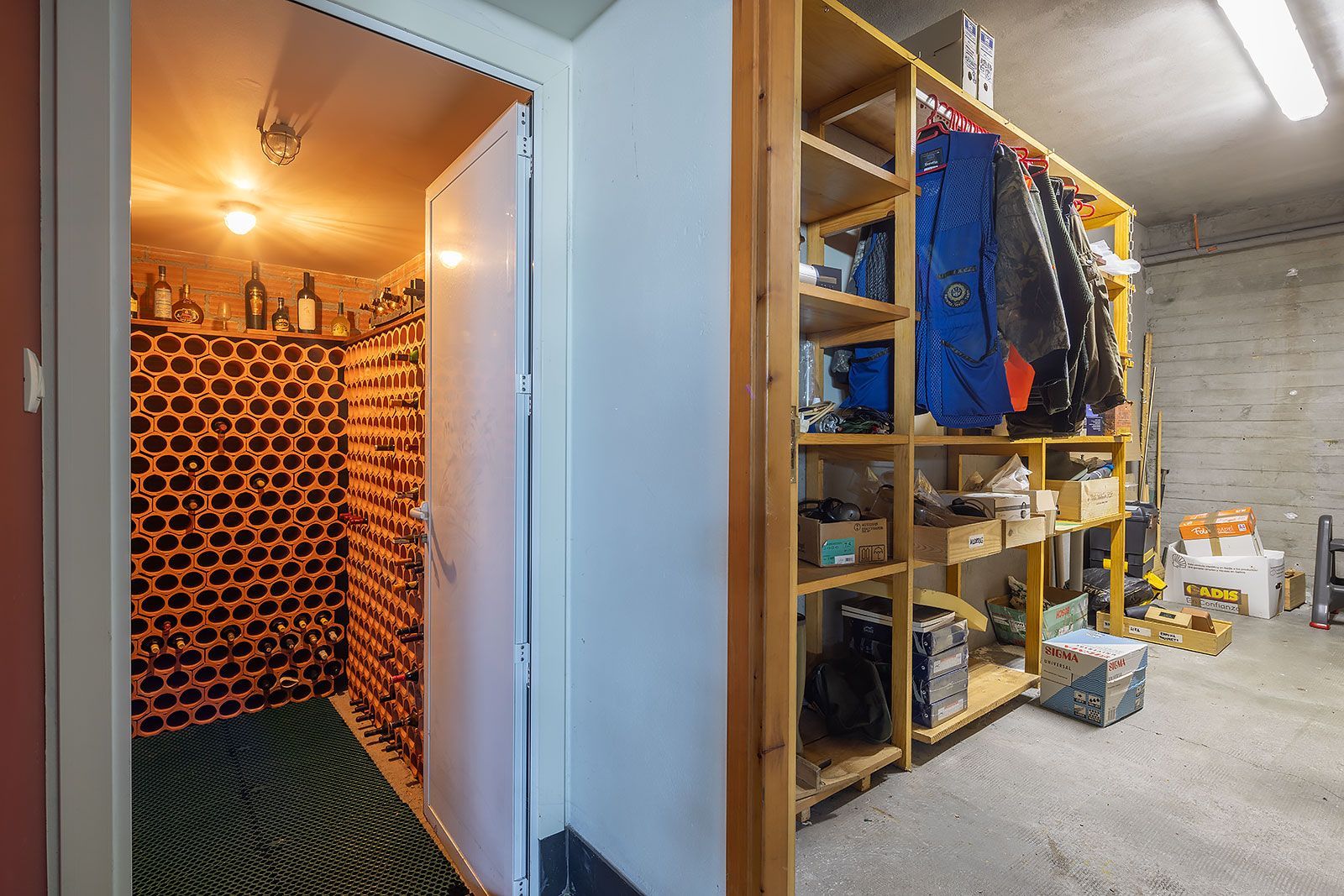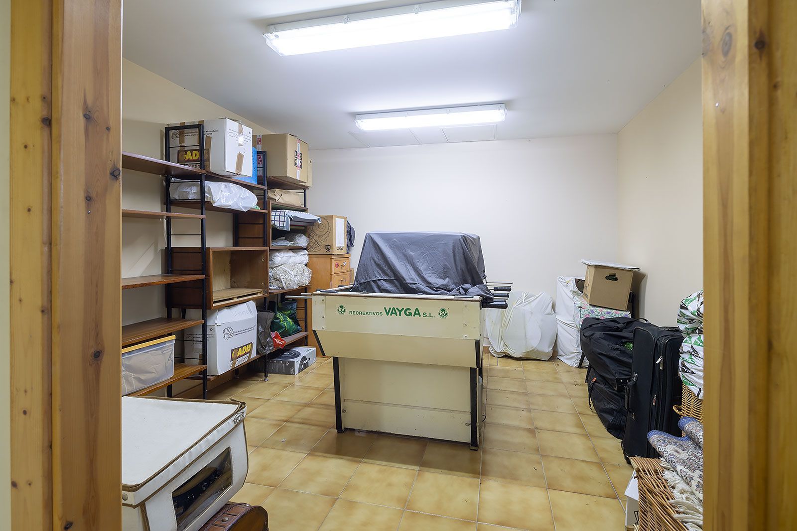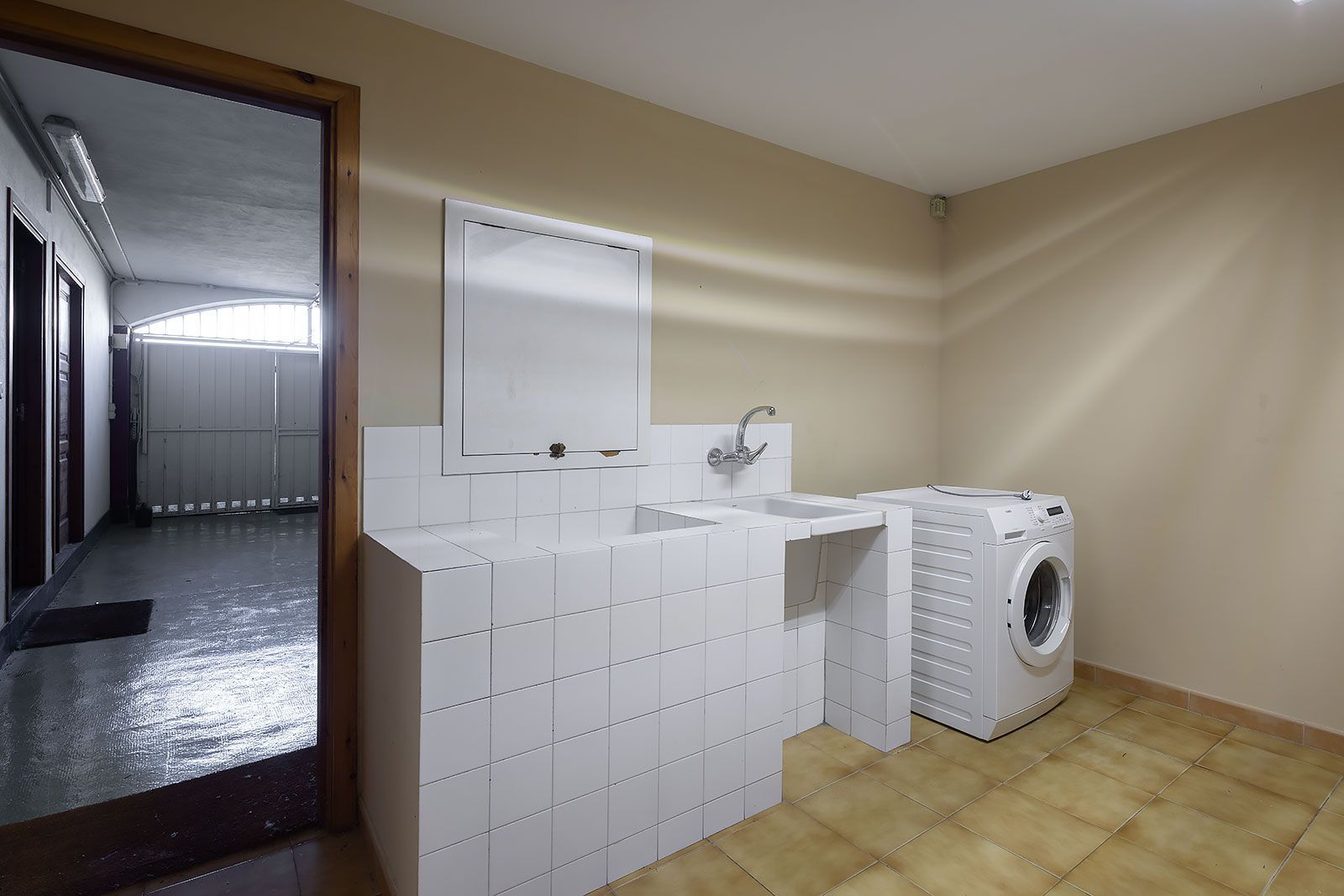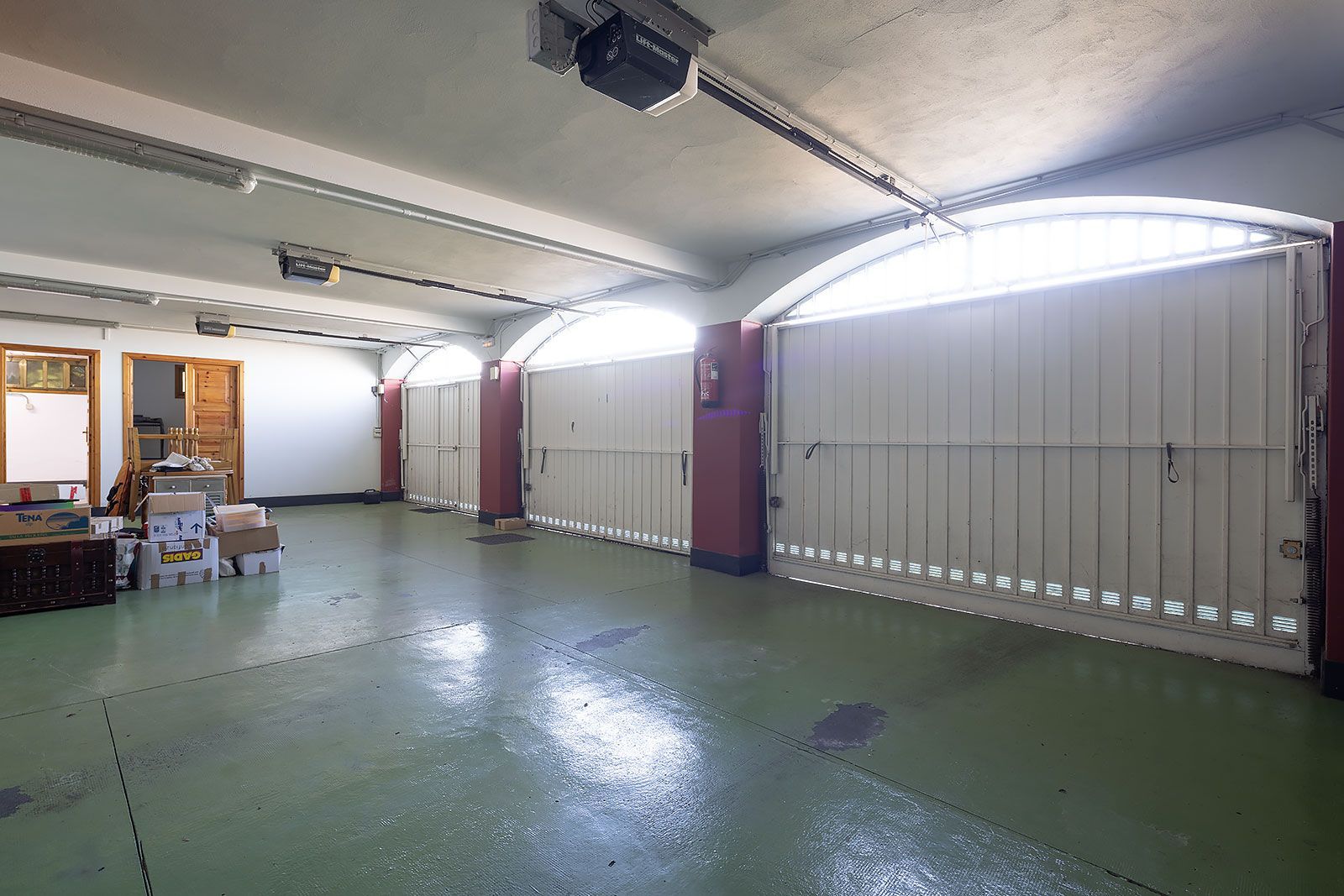 A través de una cómoda escalera se accede a la planta baja inferior, que incluye un amplísimo garaje para varios vehículos al que se accede por tres grandes portalones exteriores, además de varias amplias estancias habilitadas como despacho de trabajo la primera, habitación de servicio la segunda, baño de servicio, lavandería, taller, sala de calderas y bodega las otras.