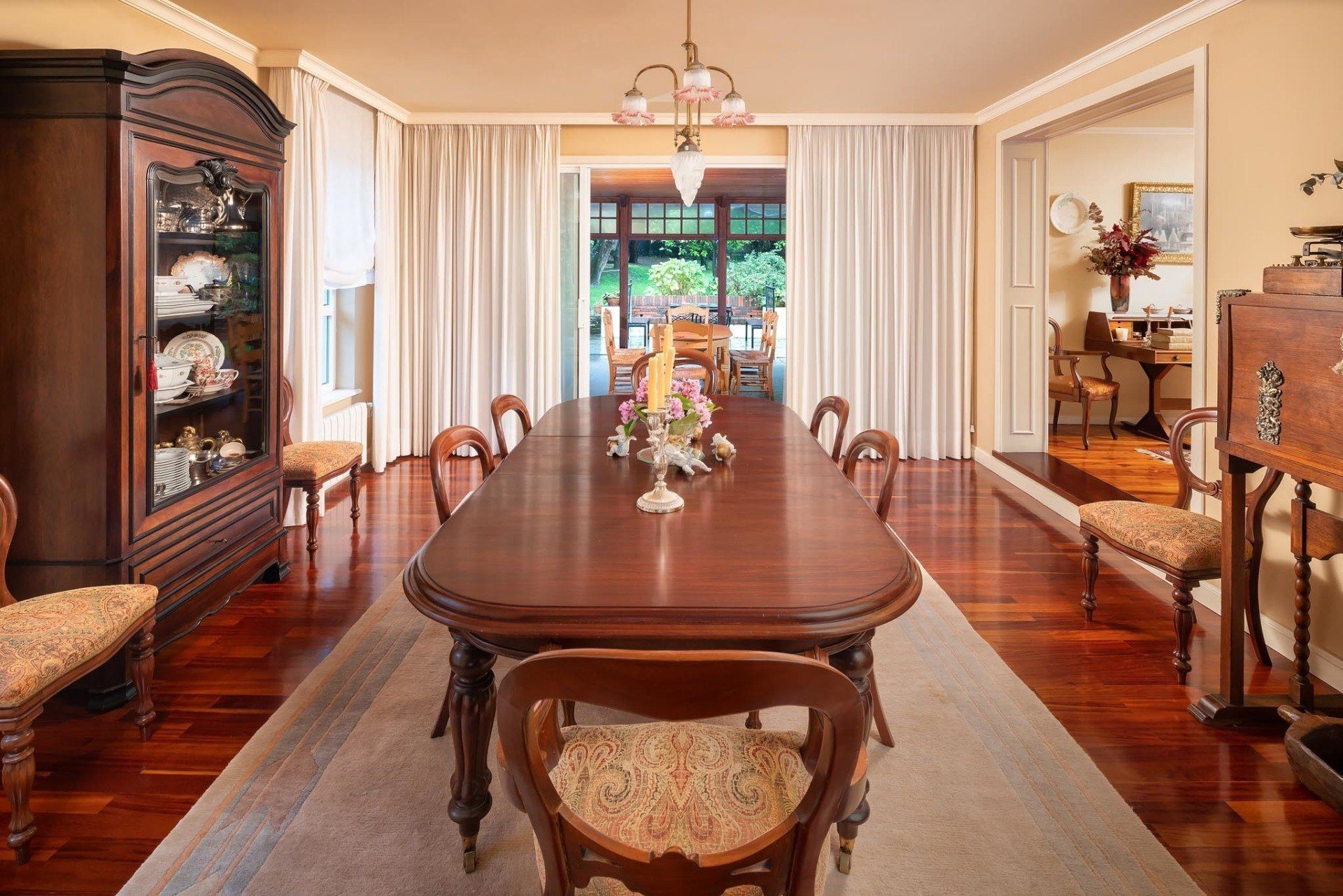 En la planta baja tenemos un amplio hall, salón en varios ambientes, porches anterior y posterior muy amplio, comunicado por la cocina, un servicio, un dormitorio y además, el que hoy es utilizado como dormitorio principal con baño en suite y con una pequeña estancia anexa.
