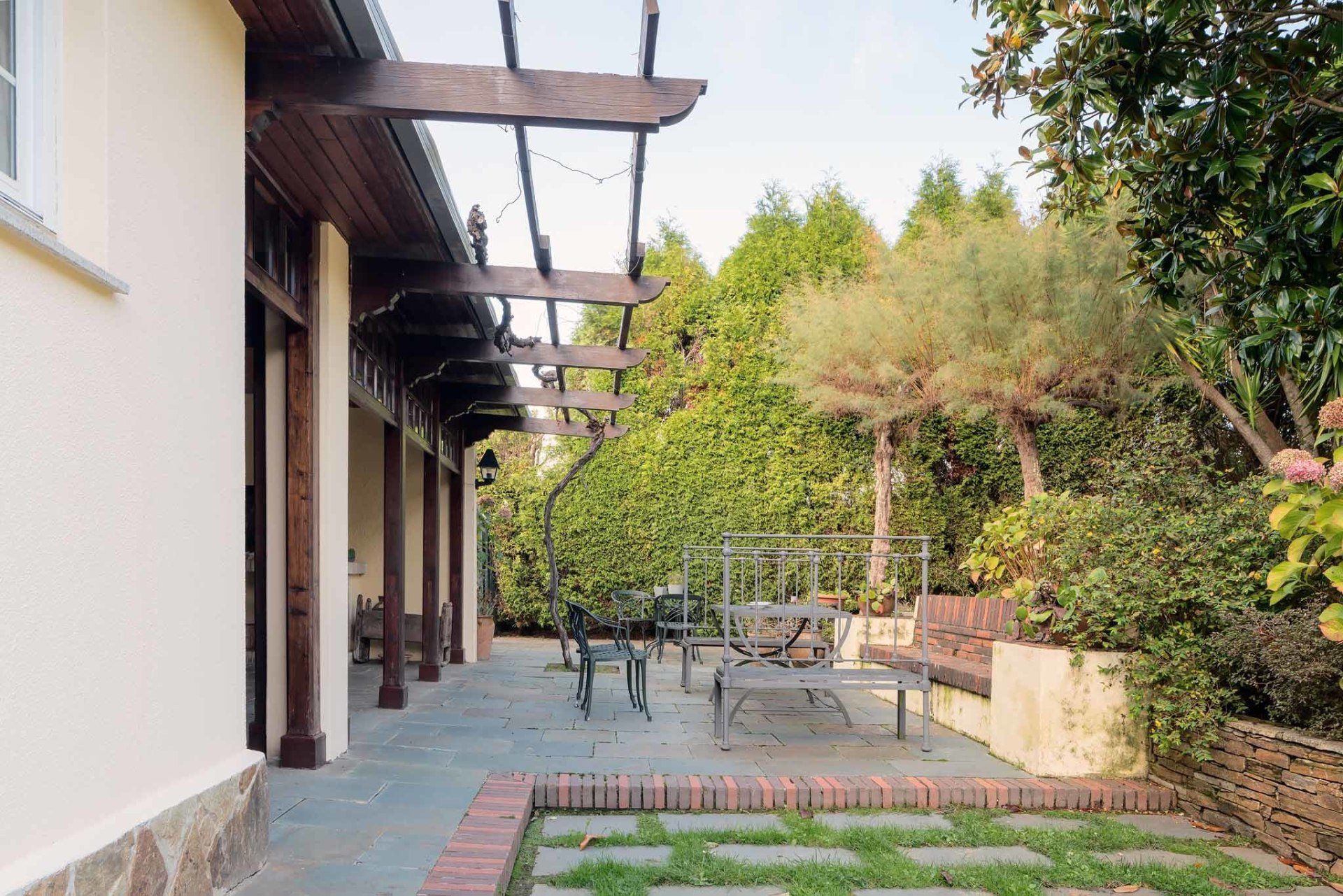 Parcela privada ajardinada, llana y con iluminación exterior. Muy cuidada, con árboles y plantas ornamentales, piscina de 10x5 metros, amplia zona de aparcamiento y cierre de piedra exterior.