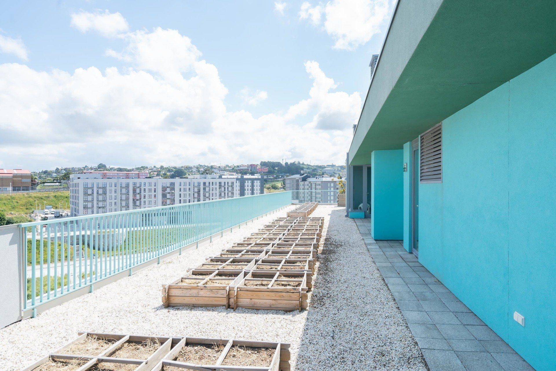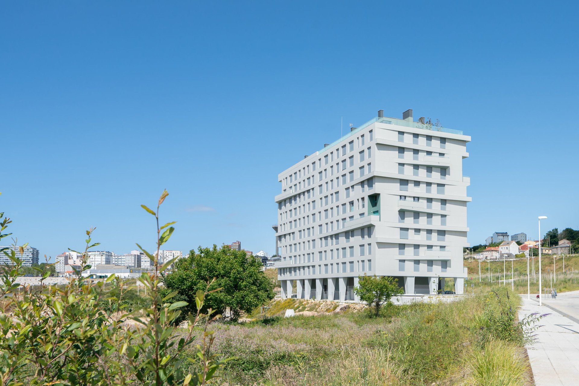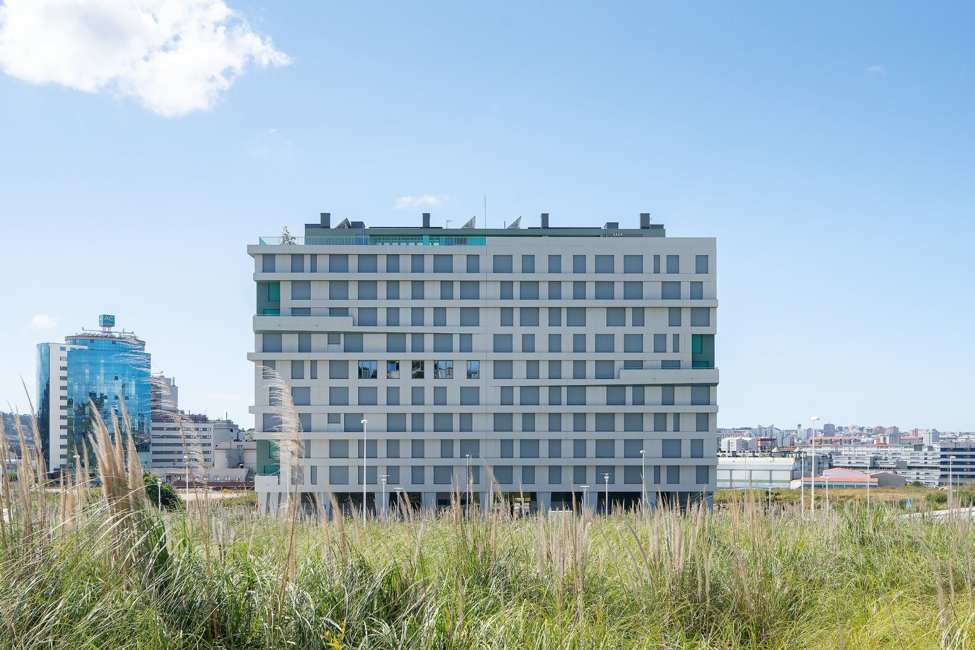 Edificio con calidades excelentes, fachada ventilada y acabado exterior de placas de gres porcelánico de gran formato reforzado con fibra de vidrio, cubierta transitable ajardinada, ventanas y puertas de terraza de aperturas oscilobatiente y osciloparalela respectivamente, con carpintería de aluminio con rotura de puente térmico, acristalamiento de doble hoja 8+12+6 con vidrios de control solar de baja emisividad y persianas exteriores de lamas de aluminio de alta protección solar· Aireadores de ventilación verticales en guía de persiana, tipo AIRCASETE.