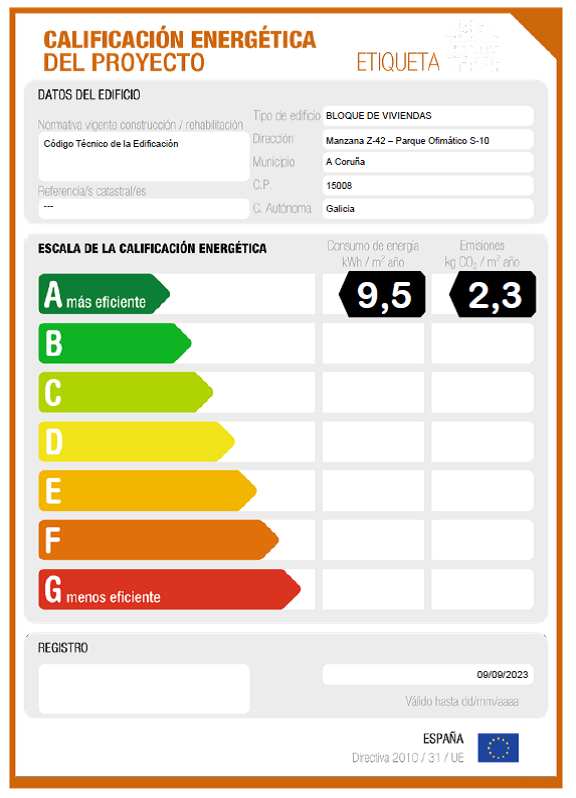 El edificio ha obtenido la CALIFICACIÓN ENERGÉTICA “A” gracias a la reducción del consumo de energía no renovable necesaria para la climatización del edificio (calefacción y refrigeración) y A.C.S., aplicando medidas pasivas de diseño para la reducción de la demanda energética y la eficiencia de los sistemas.