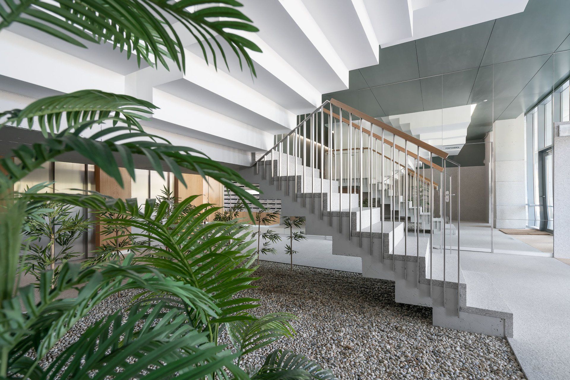 Ascensores de alta velocidad, Instalación anti-incendios completa en edificio y viviendas, Sistema de contenedores soterrados hidráulicos tipo FDB para recogida selectiva, soportal de 4 metros de fondo alrededor de la planta baja, pavimentado de adoquín de granito flameado, con inserción de parterres ajardinados con instalación de riego con aprovechamiento de agua de pluviales.